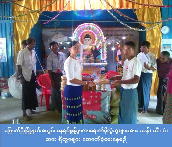 မောင်တောခရိုင်အတွင်း အစွန်းရောက်ဘင်္ဂါလီများ၏အကြမ်းဖက်မှုကြောင့် နေရပ်စွန့်ခွာကာ မြောက်ဦးမြို့နယ် အတွင်း ခိုလှုံရာနေရာ(၈)ခုတွင် လာရောက်ခိုလှုံနေသော အိမ်ထောင်စု(၆၇) စု၊ လူဦးရေ (၂၂၁) ဦးအတွက် ဆန်ရိက္ခာ (၁၆) အိတ် (၂) ပြည် (၆) ဗူး၊ ဆီ(၃၃.၅)ပိဿာ၊ ဆား(၁၆.၇၅)ပိဿာ၊ ပဲ(၃၃.၅)ပိဿာတို့အား မြောက်ဦးခရိုင်ဦးစီးမှူးရုံး(ကဆရ)မှ တာဝန်ရှိသူများသည် (၉-၉-၂၀၁၇) ရက်နေ့တွင် သွားရောက်ထောက်ပံ့ ပေးခဲ့ကြောင်း သိရှိရပါသည်။