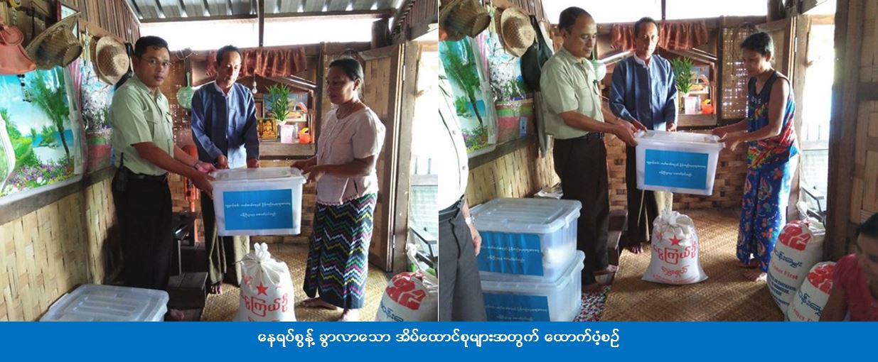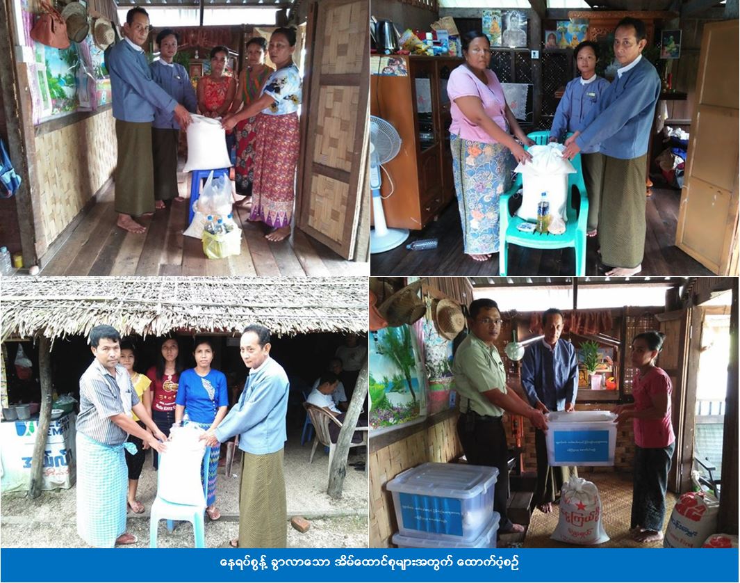 ကျောက်ဖြူခရိုင်ဦးစီးမှူးရုံးမှ တာဝန်ရှိသူများ၊ ကျောက်ဖြူခရိုင်အထွေထွေအုပ်ချုပ်ရေးမှူးနှင့် မြို့နယ်အထွေထွေအုပ်ချုပ်ရေးမှူးတို့သည် နေရပ်စွန့်ခွာလာပြီး ၎င်းတို့၏ ဆွေမျိုးများနေအိမ်တွင် ခေတ္တခိုလုံနေသော အိမ်ထောင်စု(၅)စုအတွက် ပလတ်စတစ်စ်ပုံးပါ ကယ်ဆယ်ရေးပစ္စည်း (၁၀) မျိုး (၅) အိမ်ထောင်စာအား (၈-၉-၂၀၁၇) ရက်နေ့တွင်လည်းကောင်း၊ (၉-၉-၂၀၁၇) ရက်နေ့တွင် အိမ်ထောင်စု(၁)စုလျှင် ဆီ (၅၀)ကျပ်သား၊ ဆား(၅၀)ကျပ်သား၊ ပဲ(၅၀)ကျပ်သားနှုန်းဖြင့် အိမ်ထောင်စု(၅)စုစာနှင့် လူဦးရေ(၂၆)ဦးအတွက် ဆန်ရိက္ခာ(၇)ရက်စာတို့ကိုလည်းကောင်း အိမ်တိုင်ရာရောက်သွားရောက်ထောက်ပံ့ခဲ့ကြောင်း သိရှိရပါသည်။