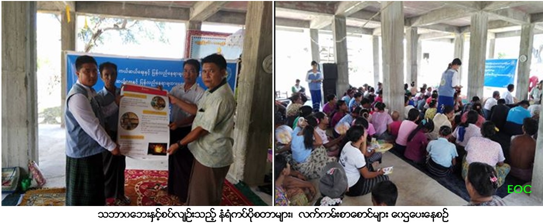 လူမှှုဝန်ထမ်း၊ ကယ်ဆယ်ရေးနှင့် ပြန်လည်နေရာချထားရေးဝန်ကြီးဌာန၊ ကယ်ဆယ်ရေးနှင့်ပြန်လည်နေရာချထားရေးဦးစီးဌာန၊ မကွေးတိုင်း ဒေသကြီး၊ ပခုက္ကူခရိုင်ဦးစီးမှူးရုံးမှ တာဝန်ရှိသူများသည် (၁၃-၉-၂၀၁၇) ရက်နေ့တွင် ပခုက္ကူခရိုင်၊ ပခုက္ကူမြို့နယ်၊ ကျွဲတဲကျေးရွာအုပ်စု၊ အေးကျွန်းကျေးရွာ ဘုန်းတော်ကြီးကျောင်း၌ သဘာဝဘေးအသိပညာပေးဟောပြောပွဲကျင်းပပြုလုပ်ခဲ့ပြီး လက်ကမ်းစာစောင်များ ဝေဌခြင်း နံရံကပ်ပိုစတာများဝေငှခြင်းနှင့် လူမှှုဝန်ထမ်း၊ ကယ်ဆယ်ရေးနှင့် ပြန်လည်နေရာချထားရေးဝန်ကြီးဌာန၊ ပြည်ထောင်စုဝန်ကြီး၏ ရက် (၁၀၀) အလွန် ဆောင်ရွက်မည့်စီမံကိန်းများတွင် တစ်ခုအပါအဝင်ဖြစ်သည့် သဘာဝဘေးနှင့်စပ်လျဉ်းသည့် ပုံမှန်သတင်းများနှင့် အရေးကြီး သတင်း များ၊ မိုးလေဝသသတင်းများနှင့် မြန်မာနိုင်ငံအတွင်း သဘာဝဘေးအန္တရာယ်လျော့ပါးရေး ဆောင်ရွက်ချက်သတင်းများကို အချိန်နှင့်တပြေးညီ ပေးပို့ခြင်း၊ ဖြစ်ပေါ်လာနိုင်သည့် ဘေးအန္တရာယ်နှင့်စပ်လျဉ်းသည့် ကြိုတင်သတိပေး Message ပေးပို့သည့်စနစ်၊ အရေးကြီးဖုန်းနံပါတ်များနှင့် သဘာဝဘေးပညာပေး/လက်ကမ်းစာစောင်များ ထည့်သွင်းထားသော DAN Application အား ရှင်းလင်းပြောကြားခဲ့ပြီး ကျေးရွာ သူ/သားများ၏ လက်ကိုင်ဖုန်းများ၌ DAN Application အား ထည့်သွင်းပေးခဲ့ပါသည်၊၊ ထိုဟောပြောပွဲသို့ ကျေးရွာသူ/သား (၁၆၀) ဦးခန့် တက်ရောက်ခဲ့ကြောင်း သတင်းရရှိပါသည်။