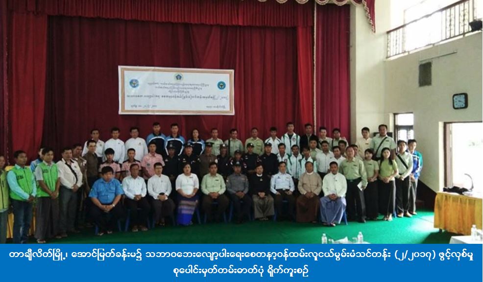 ကယ်ဆယ်ရေးနှင့် ပြန်လည်နေရာချထားရေးဦးစီးဌာန၊ ကျိုင်းတုံခရိုင်းဦးစီးမှူးရုံးမှ တာဝန်ရှိသူများသည် (၁၈-၉-၂၀၁၇) ရက်နေ့၊ နံနက် (၀၉းဝဝ) အချိန်တွင် တာချီလိတ်မြို့၊ အောင်မြတ်ခန်းမ၌ သဘာဝဘေးလျော့ပါးရေးစေတနာ့ဝန်ထမ်းလူငယ်မွမ်းမံသင်တန်း (၂/၂၀၁၇) အား ဖွင့်လှစ်ခဲ့ရာ ဖွင့်ပွဲအခမ်းအနားသို့ သင်တန်းသား (၅၀) ဦးနှင့် အခမ်းအနားတက်ရောက်သူ (၇၀) ဦး စုစုပေါင်း (၁၂၀) ဦးတက်ရောက်ခဲ့ကြောင်း သိရှိရပါသည်။