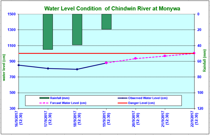 ၂၀၁၇ ခုနှစ်၊ စက်တင်ဘာလ (၁၉)ရက် (၁၆:၀၀) နာရီအချိန်တွင် မိုးလေဝသနှင့်ဇလဗေဒညွန်ကြားမှုဦးစီးဌာန မှ မြစ်ရေကြီးခြင်းသတိပေးချက်ကို အောက်ပါအတိုင်း ထုတ်ပြန် ထားပါသည်။