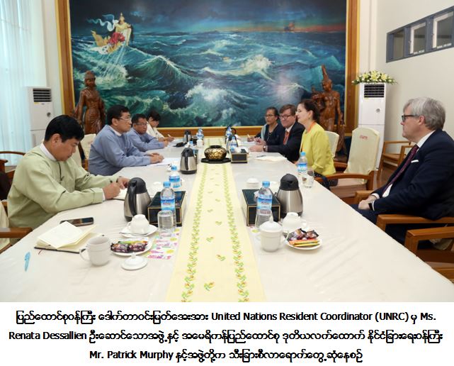 ယင်းသို့တွေ့ဆုံရာတွင် Ms. Renata Dessallien က နိုင်ငံတော်အစိုးရ၏ ရခိုင်ပြည်နယ်အတွက် ဆောင်ရွက်မှု များအား အသိအမှတ်ပြုဝမ်းမြောက်ပါကြောင်း၊ လတ်တလောစားဝတ်နေရေး ထောက်ပံ့မှုများအပြင် ရေရှည် အတွက် ကျယ်ကျယ်ပြန့်ပြန့် ပြန်လည်ထူထောင်ရေးများဆောင်ရွက် နိုင်ရေးအတွက် ပူးပေါင်းကူညီဆောင်ရွက် လိုပါကြောင်း၊ ကုလသမဂ္ဂအဖွဲ့အစည်းနှင့် နိုင်ငံတကာအစိုးရမဟုတ်သော အဖွဲ့အစည်းများအနေဖြင့် အဖွဲ့ အစည်းအလိုက် သတ်မှတ်တာဝန်များရှိသဖြင့် ယင်းသို့ သတ်မှတ်တာဝန်အရ ဆောင်ရွက်ရသည့် လုပ်ငန်းများအား ဒေသခံပြည်သူများနားလည်နိုင်ရေးအတွက် နိုင်ငံတော်အစိုးရမှ ကူညီဆောင်ရွက်ပေးစေလိုပါကြောင်း၊ အကူအညီ များပေးရာတွင် ဘေးဒုက္ခအမျိုးအစားအလိုက် လိုအပ်ချက်ကွဲပြားနိုင်သဖြင့် ယင်းအချက်ကိုလည်း ထည့် သွင်း စဉ်းစား သင့်ပါကြောင်း ဆွေးနွေးပါသည်။