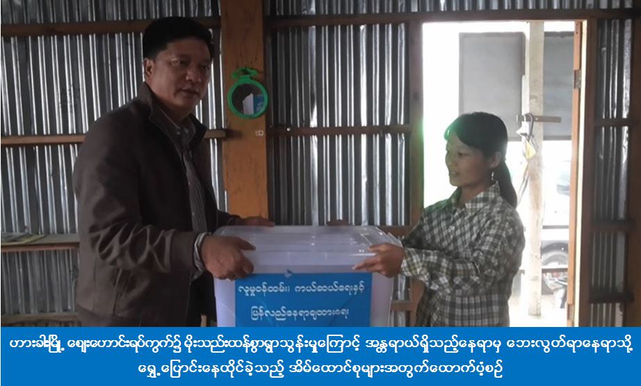 (၁၈-၉-၂၀၁၇) ရက်နေ့တွင် မိုးရွာသွန်းမှုကြောင့် ဟားခါးမြို့၊ စျေးဟောင်းရပ်ကွက်၊ ဒါအုချိန်းလမ်း၌ အန္တရာယ်ရှိ လူနေအိမ်(၂)လုံး၊ အိမ်ထောင်စု(၂)စုမှ လူဦးရေ(၈)ဦးတို့အား ဘေးလွတ်သည့်နေရာသို့ ရွှေ့ပြောင်းနေထိုင်ခဲ့ရာ အဆိုပါအိမ်ထောင်စုများအတွက် ချင်းပြည်နယ်ဦးစီးမှူးရုံး (ကဆရ) မှ တာဝန်ရှိသူများသည် ကယ်ဆယ်ရေးပစ္စည်း(၁၀)မျိုးနှင့် လူဦးရေ(၈)ဦးအတွက် ဆန်ရိက္ခာ(၇)ရက်စာဖိုးငွေ (၁၆၈၀၀) ကျပ်အား (၁၉-၉-၂၀၁၇) ရက်နေ့တွင် ပြည်နယ်လူမှုရေးဝန်ကြီးနှင့်အတူ ထောက်ပံ့ခဲ့ကြောင်း သိရှိရပါသည်။