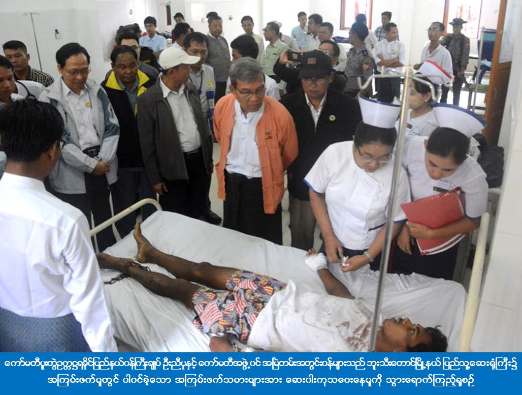 ဆက်လက်ပြီး ကော်မတီပူးတွဲဥက္ကဋ္ဌနှင့်အဖွဲ့ဝင်များသည် ဘူးသီးတောင်မြို့နယ် ပြည်သူ့ဆေးရုံကြီး၌ အကြမ်းဖက်မှုတွင် ပါ၀င်ခဲ့သော အကြမ်းဖက်သမားများအား ဆေးဝါးကုသပေးနေမှုကို သွားရောက်ကြည့်ရှုကြသည်။