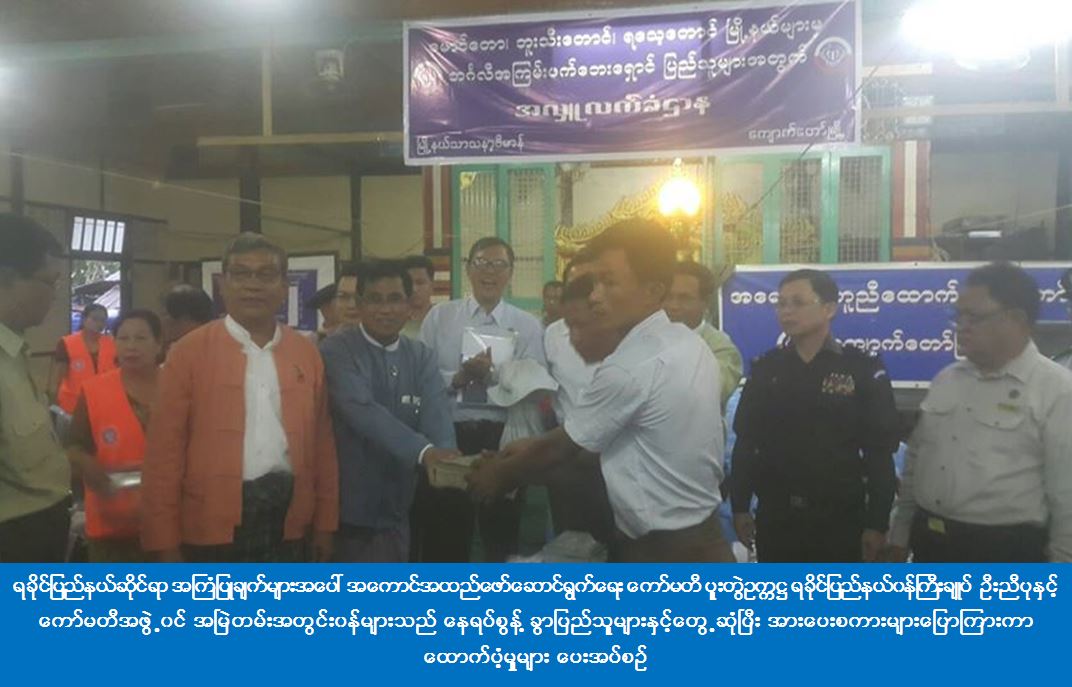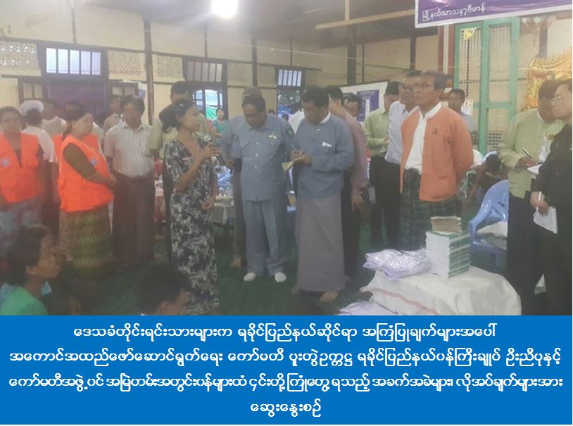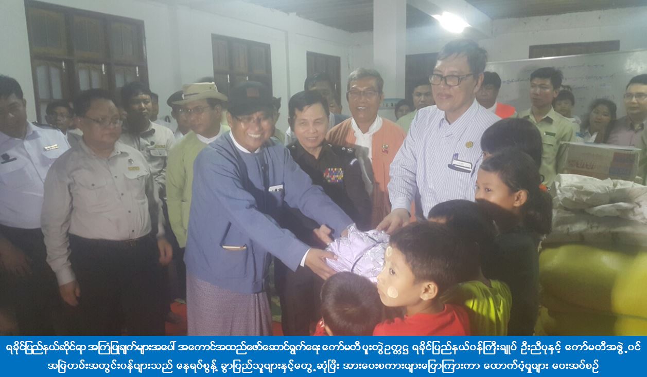 ရခိုင်ပြည်နယ်ဆိုင်ရာ အကြံပြုချက်များအပေါ် အကောင်အထည်ဖော်ဆောင်ရွက်ရေးကော်မတီ ပူးတွဲဥက္ကဋ္ဌနှင့်အဖွဲ့ဝင်များသည် ဘူးသီးတောင်မြို့ အလိုတော်ပြည့်ဘုန်းတော်ကြီးကျောင်းဝင်းစုရပ်၌ နေရပ် စွန့်ခွာပြည်သူများနှင့်တွေ့ဆုံပြီး အားပေးစကားများပြောကြားကာ စားနပ်ရိက္ခာနှင့် ထောက်ပံ့ငွေများ ပေးအပ်ကြ သည်။