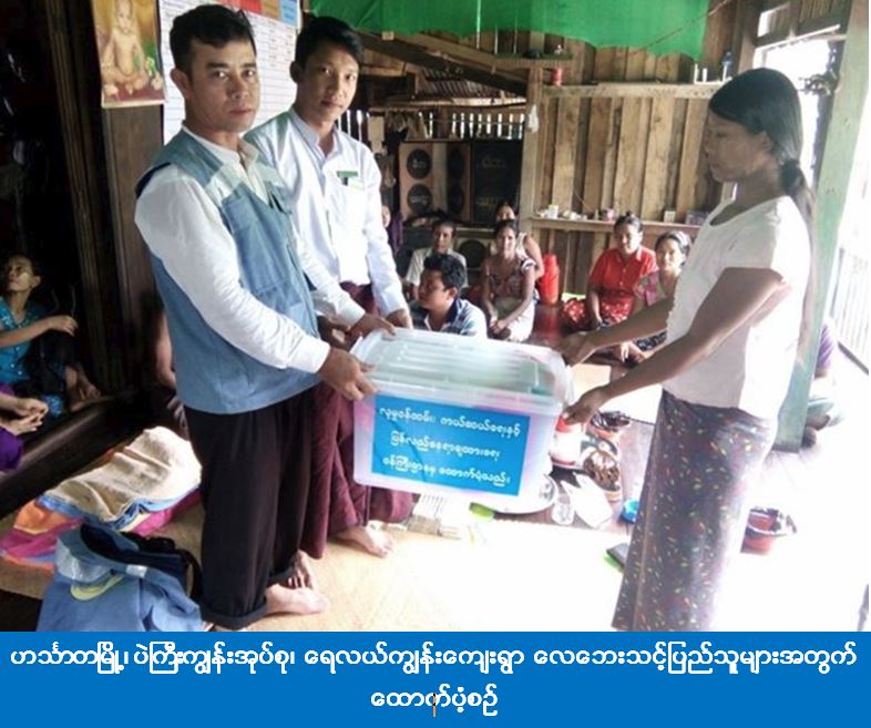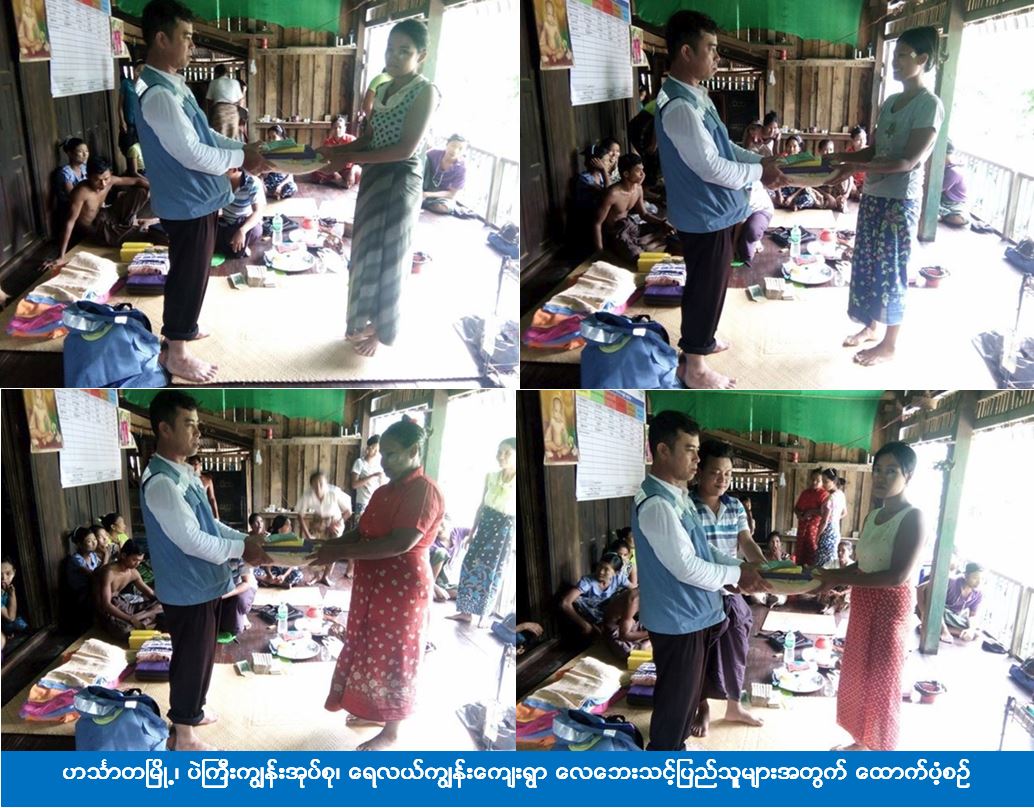 ဟင်္သာတမြို့၊ ပဲကြီးကျွန်းအုပ်စု၊ ရေလယ်ကျွန်းကျေးရွာ၌ (၁၃-၉-၂၀၁၇) ရက်နေ့တွင် ဖြစ်ပွားခဲ့သော လေဘေးကြောင့် ဘေးသင့်ခဲ့သည့် အိမ်ခြေ (၁၅) လုံး၊ အိမ်ထောင်စု (၁၅) စု၊ လူဦးရေ (၈၁) ဦးတို့အတွက် ကယ်ဆယ်ရေးပစ္စည်း (၄) မျိုး (၁၄) အိမ်ထောင်စာ၊ ကယ်ဆယ်ရေးပစ္စည်း (၉) မျိုး (၁) အိမ်ထောင်စာ(ပလတ်စတစ်ပုံးပါ)၊ အိမ်ဆောက်ပစ္စည်းဖိုး (၈၉၅၀၀၀) ကျပ်၊ ဆန်ရိက္ခာဖိုး (၁၇၀၁၀၀) ကျပ်၊ စုစုပေါင်း ကယ်ဆယ်ရေးရန်ပုံငွေ (၁၀၆၅၁၀၀) ကျပ်တို့ကို ဟင်္သာတခရိုင်ဦးစီးမှူးရုံး (ကယ်ဆယ်ရေး) မှတာဝန်ရှိသူများသည် (၂၃-၉-၂၀၁၇) ရက်နေ့တွင် ဘေးသင့်ပြည်သူများလက်ဝယ်သို့ ကွင်းဆင်းထောက်ပံ့ခဲ့ကြောင်း သိရှိရပါသည်။