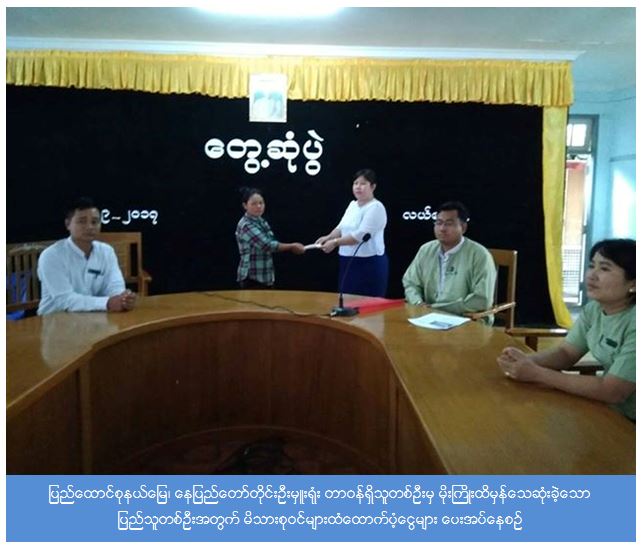 ကယ်ဆယ်ရေးနှင့် ပြန်လည်နေရာချထားရေးဦးစီးဌာန၊ ပြည်ထောင်စုနယ်မြေ၊ နေပြည်တော်တိုင်းဦးမှူးရုံးမှတာဝန်ရှိသူများသည် (၂၂-၉-၂၀၁၇)ရက်နေ့တွင် လယ်ဝေးမြို့နယ်၊ ကျသောင်းတောင်အုပ်စု၊ ကျောက်မဆင်ချောင်းအနီးရှိ ယာကွက်အတွင်း နွားကျောင်းရန်ထွက်သွားရာမှ မိုးကြိုးထိမှန်သေဆုံးခဲ့သော ပြည်သူတစ်ဦးအတွက် ထောက်ပံ့ငွေ (၃၀၀,၀၀ဝိ/-) ကျပ်တိတိအား (၂၅-၉-၂၀၁၇)ရက်နေ့တွင် မိသားစုဝင်များထံသို့ ကွင်းဆင်းထောက်ပံ့ပေးခဲ့ကြောင်း သတင်းရရှိပါသည်။Source: ပြည်ထောင်စုနယ်မြေ၊ နေပြည်တော်တိုင်းဦးမှူးရုံး (ကဆရ)