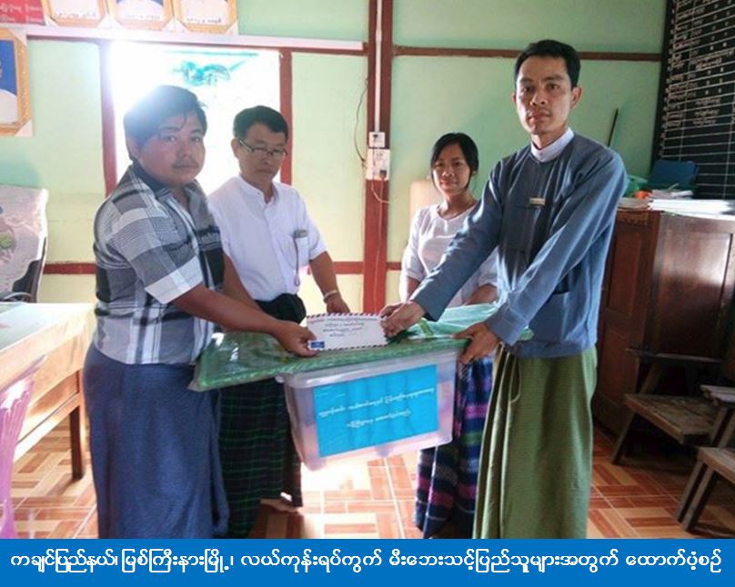 ကချင်ပြည်နယ်၊ မြစ်ကြီးနားမြို့၊ လယ်ကုန်းရပ်ကွက်၌ (၂၁-၉-၂၀၁၇) ရက်နေ့တွင် ဖြစ်ပွားခဲ့သော မီးဘေးကြောင့် ဘေးသင့်ခဲ့သည့် အိမ်ခြေ (၃) လုံး၊ အိမ်ထောင်စု (၃) စု၊ လူဦးရေ (၁၃) ဦးတို့အတွက် ကယ်ဆယ်ရေးပစ္စည်း(၁၇)မျိုး (၃) အိမ်ထောင်စုစာ၊ ဆန်ရိက္ခာ(၇)ရက်စာ (၂၇၃၀၀ိ/-)နှင့် အိမ်ဆောက်ပစ္စည်းဖိုး (၆၀၀၀၀၀ိ/-) အား (၂၆-၉-၂၀၁၇) ရက်နေ့တွင် ကချင်ပြည်နယ်ဦးစီးမှူးရုံး (ကဆရ) မှ တာဝန်ရှိသူများက ကွင်းဆင်းထောက်ပံ့ခဲ့ကြောင်း သိရှိရပါသည်။