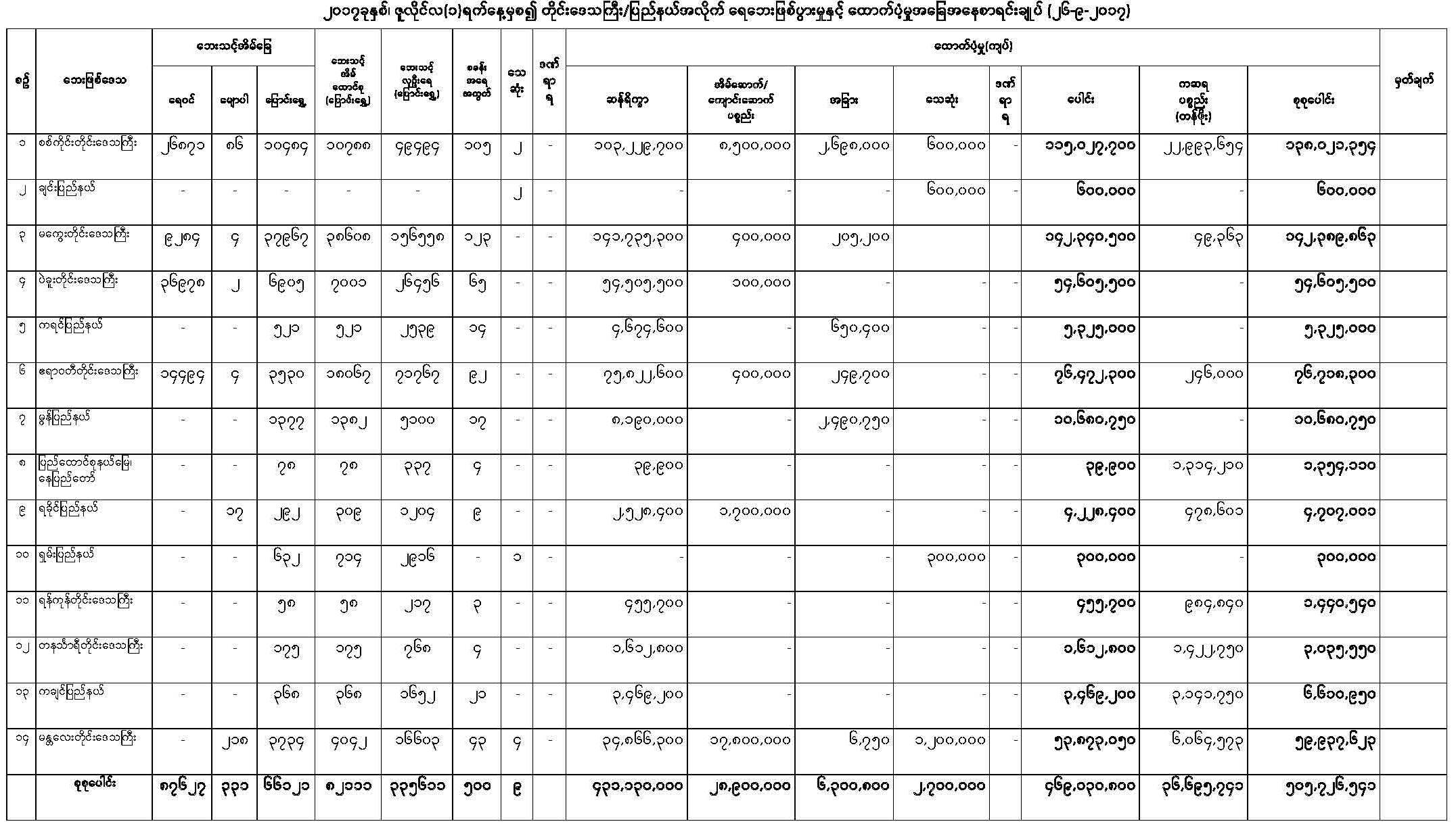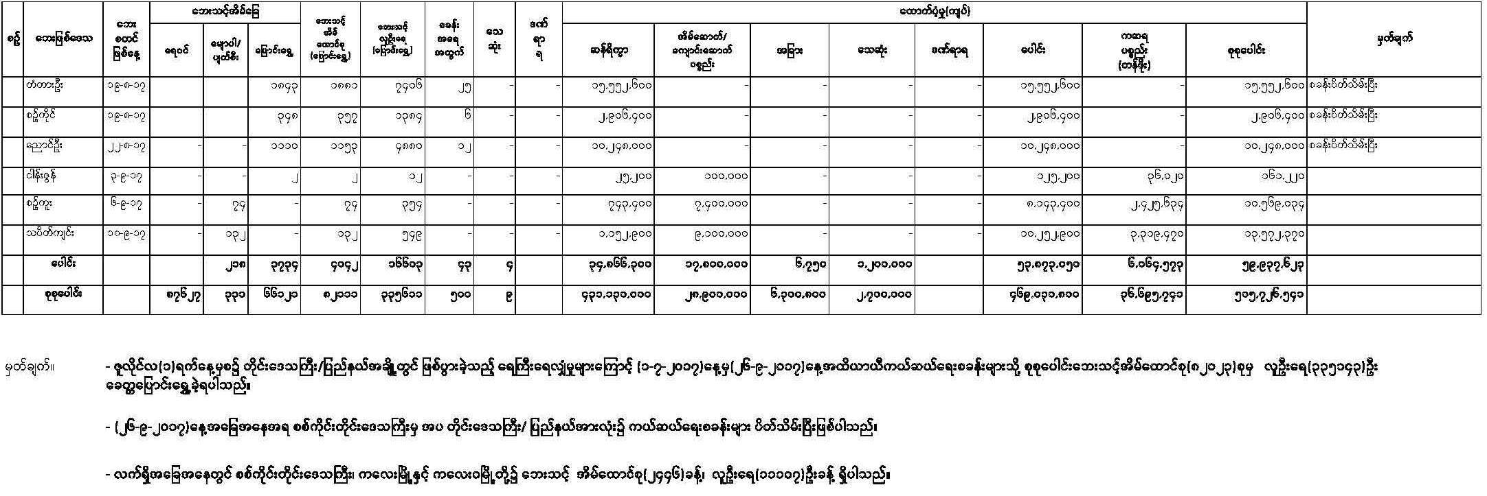 ၂၀၁၇ ခုနှစ်၊ ဇူလိုင် (၁) ရက်နေ့မှ စက်တင်ဘာလ (၂၆) ရက်နေ့အထိ တိုင်းဒေသကြီး / ပြည်နယ် များတွင် ရေဘေးဖြစ်ပွားမှုနှင့် လူမှုဝန်ထမ်း၊ ကယ်ဆယ်ရေးနှင့် ပြန်လည်နေရာချထားရေးဝန်ကြီးဌာနမှ ထောက်ပံ့မှုအခြေအနေ