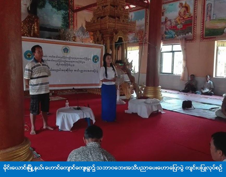 ကယ်ဆယ်ရေးနှင့် ပြန်လည်နေရာချထားရေးဦးစီးဌာန၊ ကျိုင်းတုံခရိုင်ဦးစီးမှူးရုံးမှ တာဝန်ရှိသူများသည် (၂၆-၉-၂၀၁၇) ရက်နေ့၊ (၁၃းဝဝ) နာရီအချိန်တွင် မိုင်းယောင်းမြို့နယ်၊ ဟောင်ကျောင့်ကျေးရွာ၌ သဘာဝဘေးအသိပညာပေးဟောပြောပွဲ ကျင်းပပြုလုပ်ခဲ့ရာ တာဝန်ရှိသူများက မြန််မာနိုင်ငံတွင် ဖြစ်ပေါ်နေသည့် သဘာဝဘေးအန္တရာယ်များအကြောင်း၊ သဘာဝဘေးအန္တရာယ်ဖြစ်ပွားလာပါက ဆောင်ရန်၊ ရှောင်ရန်များ၊ ဦးစီးဌာန၏လုပ်ငန်းတာဝန်များနှင့် ရည်ရွယ်ချက်တို့ကို ရှင်းလင်းခဲ့ပြီး သရုပ်ပြလေ့ကျင့်ခြင်းနှင့် လက်ကမ်းစာစောင်များဖြန့်ဝေခြင်းများ ဆောင်ရွက်ခဲ့ရာ ပြည်သူူလူထု (၁၀၀) ဦးတက်ရောက်ခဲ့ကြောင်း သိရှိရပါသည်။