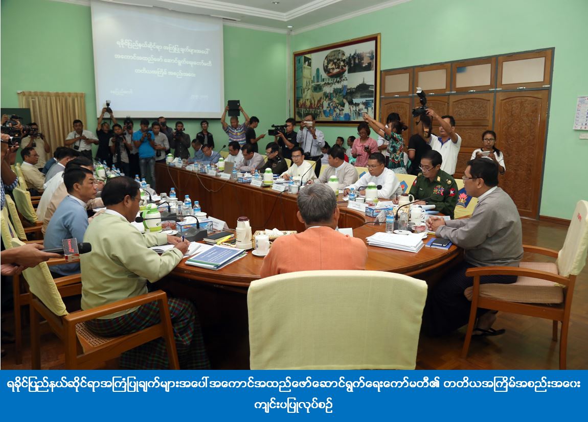 ရခိုင်ပြည်နယ်ဆိုင်ရာအကြံပြုချက်များအပေါ် အကောင်အထည်ဖော် ဆောင်ရွက်ရေးကော်မတီ၏ တတိယအကြိမ်အစည်းအဝေးကို (၂၇-၉-၂၀၁၇) ရက်နေ့၊ မွန်းလွဲပိုင်းက လူမှုဝန်ထမ်း၊ ကယ်ဆယ်ရေးနှင့် ပြန်လည်နေရာချထားရေးဝန်ကြီးဌာန အစည်းအဝေးခန်းမတွင် ကျင်းပပြုလုပ်ခဲ့ပါသည်။