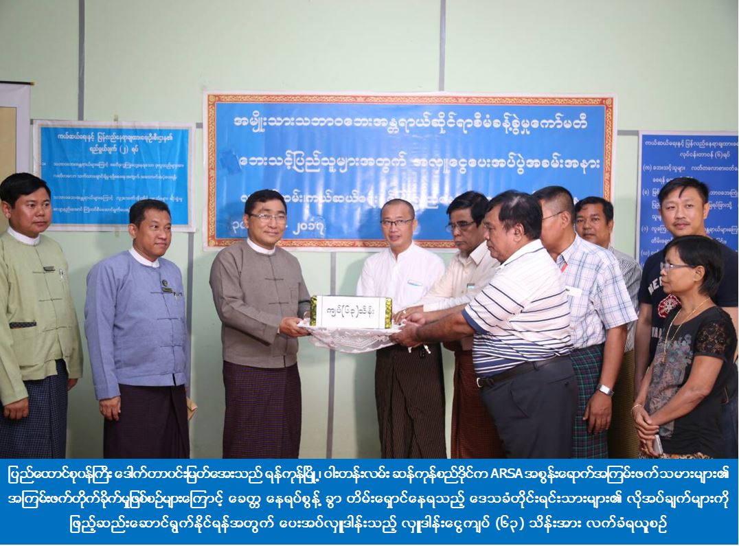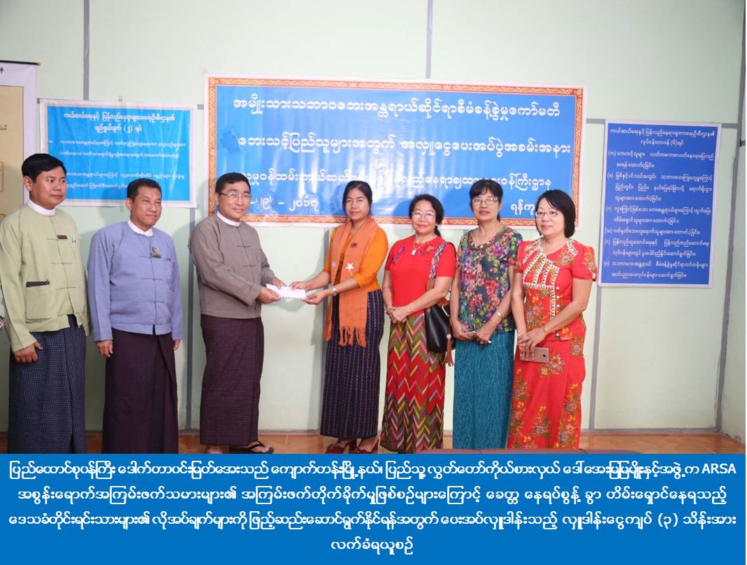 ARSA အစွန်းရောက်အကြမ်းဖက်သမားများ၏ အကြမ်းဖက်တိုက်ခိုက်မှုဖြစ်စဉ်များကြောင့် ခေတ္တ နေရပ်စွန့်ခွာ တိမ်းရှောင်နေရသည့် ဒေသခံတိုင်းရင်းသားများ၏ လိုအပ်ချက်များကို ဖြည့်ဆည်းဆောင်ရွက်နိုင်ရန်အတွက် အလှူငွေပေးအပ်လှူဒါန်းပွဲကို (၃၀-၉-၂၀၁၇) ရက်နေ့၊ နံနက်ပိုင်းက ကယ်ဆယ်ရေးနှင့် ပြန်လည်နေရာချထားရေးဦးစီးဌာန၊ ရန်ကုန်တိုင်းဒေသကြီးဦးစီးမှူးရုံးတွင် ကျင်းပပြုလုပ်ရာ ရန်ကုန်မြို့၊ ဝါးတန်းလမ်း ဆန်ကုန်စည်ဒိုင်က လှူဒါန်းငွေကျပ် (၆၃) သိန်းကိုလည်းကောင်း၊ ရန်ကုန်တိုင်းဒေသကြီး၊ ကျောက်တန်းမြို့နယ်၊ ပြည်သူ့လွှတ်တော်ကိုယ်စားလှယ် ဒေါ်အေးမြမြမျိုးနှင့်အဖွဲ့က လှူဒါန်းငွေကျပ် (၃) သိန်းကိုလည်းကောင်း တာဝန်ရှိသူများက ပေးအပ်လှူဒါန်းရာ ပြည်ထောင်စုဝန်ကြီး ဒေါက်တာဝင်းမြတ်အေးက လက်ခံရယူပြီး ဂုဏ်ပြုမှတ်တမ်းလွှာ ပြန်လည်ပေးအပ်ခဲ့ပါကြောင်း သိရှိရပါသည်။