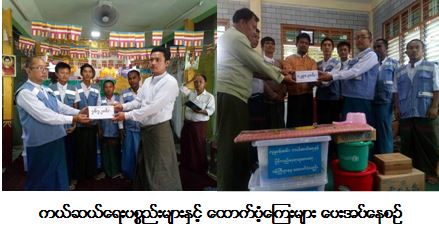 ကယ်ဆယ်ရေးနှင့်ပြန်လည်နေရာချထားရေးဦးစီးဌာန၊ မန္တလေးတိုင်းဒေသကြီးဦးစီးမှူးရုံးမှ တာဝန်ရှိသူများသည် (၅.၁၀.၂၀၁၇) ရက်နေ့ အောင်မြေသာစံမြို့နယ်၌ဖြစ်ပွားခဲ့သော မီးဘေးကြောင့် ဘေးသင့်ပြည်သူ (၄၃) ဦးအတွက် ဆန်ရိက္ခာ (၇) ရက်စာအတွက် ငွေကျပ် (၉၀၃၀၀ိ/-) တိတိ၊ လုံးဝပျက်စီးအိမ်ထောင်စု (၉) စု အတွက် (၁၇) မျိူးပါ ကယ်ဆယ်ရေးပစ္စည်း (၉) အိမ်ထောင်စာ၊ တစိတ်တပိုင်းပျက်စီး (၁) အိမ်ထောင်စုအတွက် (၁၀) မျိူးပါ ကယ်ဆယ်ရေးပစ္စည်း (၁) အိမ်ထောင်စာ၊ (၂၄)ဘူးပါ ရေသန့်ကဒ် (၉) ကဒ်၊ ရေသန့်ဆေးထုတ် (၂၄၀) ထုပ်၊ သွပ်မိုးထရံကာပျက်စီးအိမ်ထောင်စု (၈) စုအတွက် အိမ်ဆောက်ပစ္စည်းဖိုးငွေကျပ် (၈၀၀၀၀၀ိ/-) တိတိ၊ တိုက်အိမ်ပျက်စီးအိမ်ထောင်စု (၂) အတွက် အိမ်ဆောက်ပစ္စည်းဖိုး ငွေကျပ် (၄၀၀၀၀၀ိ/-) တိတိ၊ စုစုပေါင်းငွေကျပ် (၁၂၉၀၃၀၀ိ/-) တို့ကိုလည်းကောင်း၊ (၄.၁၀.၂၀၁၇) ရက်နေ့ ပြည်ကြီးတံခွန်မြို့နယ်တွင်ဖြစ်ပွားခဲ့သော မီးဘေးကြောင့် ဘေးသင့်ပြည်သူ (၃၂) ဦးအတွက် ဆန်ရိက္ခာဖိုး (၇) ရက်စာ ငွေကျပ် (၆၇၂၀၀ိ/-)တိတိ၊ သွပ်မိုးထရံကာပျက်စီးအိမ်ထောင်စု (၅) စု အတွက် ငွေကျပ် (၅)သိန်းတိတိ၊ တိုက်အိမ်ပျက်စီး အိမ်ထောင်စု (၁) စု အတွက်ငွေကျပ် (၂) သိန်း၊ စုစုပေါင်းငွေကျပ် (၇၆၇၂၀၀ိ/-) တိတိ၊ လုံးဝပျက်စီးအိမ်ထောင်စု (၈) စု အတွက် (၁၇) မျိူးပါ ကယ်ဆယ်ရေးပစ္စည်း (၈) အိမ်ထောင်စုစာ၊ တစိတ်တပိုင်းပျက်စီးအိမ်ထောင်စု (၁) စုစာအတွက် ကယ်ဆယ်ရေးပစ္စည်း (၁၀) မျိူး၊ (၁) အိမ်ထောင်စာ၊ ရေသန့်ကဒ် (၆) ကဒ်၊ ရေသန့်ဆေးထုတ် (၂၄၀) ထုပ် တို့ကို့လည်းကောင်း (၆.၁၀.၂၀၁၇)ရက်နေ့တွင် သဘာဝဘေးတုံ့ပြန်ဆောင်ရွက်ရေးအဖွဲ့(မန္တလေး)နှင့်အတူ သွားရောက်ထောက်ပံ့ခဲ့ကြောင်း သတင်းရရှိပါသည်။