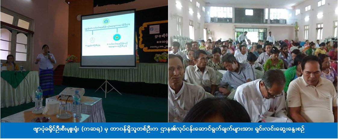 ကယ်ဆယ်ရေးနှင့် ပြန်လည်နေရာချထားရေးဦးစီးဌာနနှင့် MOU ရေထိုးထားသော LWF (Lutheran World Federation) အဖွဲ့တို့ပူးပေါင်း၍ ဖျာပုံမြို့၊ သီရိအဏ္ဏဝါခန်းမ၌ ဒေသဖွံံဖြိုးရေးများဆိုင်ရာ အလုပ်ရုံဆွေးနွေးပွဲကို အောက်တိုဘာလ (၁၁) ရက်နေ့နှင့် (၁၂) ရက်နေ့တို့တွင် ကျင်းပရာ ခရိုင်အဆင့်ဌာနဆိုင်ရာများမှ ကိုယ်စားလှယ်များက ၄င်းတို့၏လုပ်ငန်းဆောင်ရွက်ချက်များအား တက်ရောက်လာကြသည့် ဘိုကလေး၊ ဖျာပုံ၊ ဒေးဒရဲနှင့် တွံတေးမြို့နယ်အတွင်းရှိ ကျေးရွာဖွံံဖြိုးရေးကော်မတီဝင်များအား ရှင်းလင်းတင်ပြကြပြီး သိလိုသည်များအား ပြန်လည်ဖြေကြားခဲ့ကြပါသည်။ အလုပ်ရုံဆွေးနွေးပွဲသို့ အဆိုပါမြို့နယ် (၄) မြို့နယ်မှ ကော်မတီဝင် (၁၃၀) ဦးတက်ရောက်ခဲ့ကြကြောင်း သိရှိရပါသည်။
