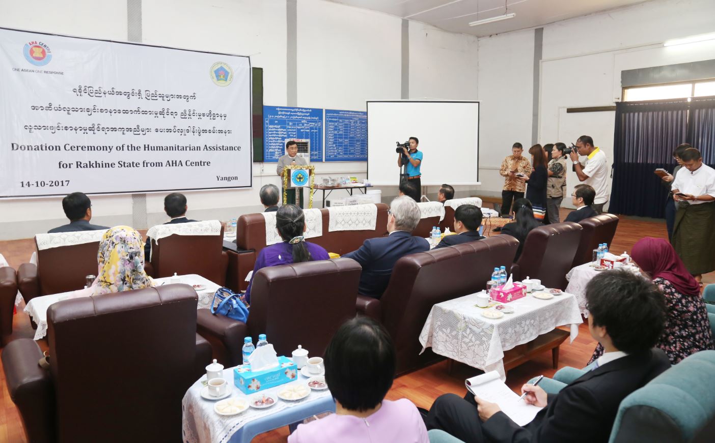 အာဆီယံလူသားချင်းစာနာထောက်ထားမှုဆိုင်ရာ ညှိနှိုင်းရေး ဗဟိုဌာန (AHA Centre) မှ ရခိုင်ဒေသတွင်း ဒုက္ခခံစားရသူအားလုံးအတွက် ကူညီထောက်ပံ့ရန် လာရောက်ခြင်းကို ကြိုဆိုပါကြောင်း၊ ဤထောက်ပံ့ပေးအပ်ပွဲအခမ်းအနားသည် အာဆီယံဒေသတွင်း နိုင်ငံအချင်း ချင်းနားလည်မှု၊ အပြန်အလှန်ယုံကြည်မှု၊ ခိုင်မြဲသော လက်တွဲမှုနှင့် ညီညွတ်ပေါင်းစည်းမှုကို ပြသခြင်းဖြစ်သည် ဟုယုံကြည်ပါကြောင်း၊