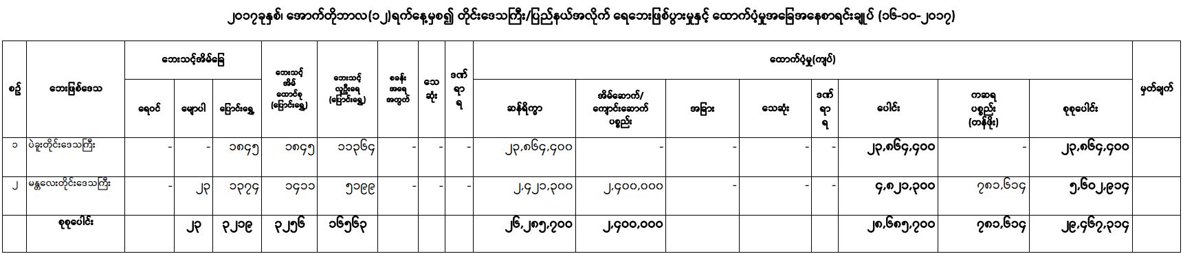 ၂၀၁၇ ခုနှစ်၊ အောက်တိုဘာလ (၁၂) ရက်နေ့မှ အောက်တိုဘာလ (၁၆) ရက်နေ့အထိ တိုင်းဒေသကြီး/ပြည်နယ်အလိုက် ရေဘေးဖြစ်ပွားမှုနှင့် ထောက်ပံ့မှုအခြေအနေစာရင်းချုပ်