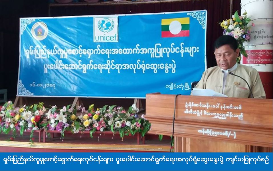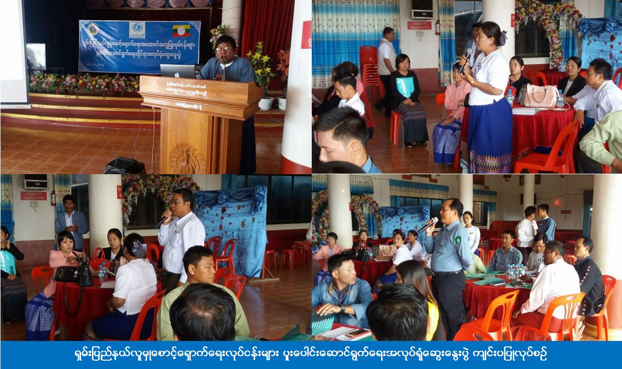 ရှမ်းပြည်နယ်လူမှုစောင့်ရှောက်ရေးလုပ်ငန်းများ ပူးပေါင်းဆောင်ရွက်ရေးအလုပ်ရုံဆွေးနွေးပွဲကို ကျိုင်းတုံမြို့၊ တိုင်းလိခန်းမ၌ (၁၆-၁၀-၂၀၁၇) ရက်နေ့တွင် ကျင်းပပြုလုပ်ခဲ့ရာ ဗမာတိုင်းရင်းသားရေးရာဝန်ကြီးမှ အမှာစကားပြောကြားခြင်း၊ ပြည်နယ်မှူး(လူမှုဝန်ထမ်း)မှ လူမှုစောင့်ရှောက်ရေးလုပ်ငန်းစဉ်များနှင့် ပြည်နယ်မှူ း(ကယ်ဆယ်ရေး)မှ သဘာဝဘေးလျော့ပါးရေးလုပ်ငန်းစဉ်များကို ဦးဆောင်ဆွေးနွေးခြင်းတို့ ဆောင်ရွက်ခဲ့ပြီး တက်ရောက်လာသူများမှ ပါဝင်ဆွေးနွေးခြင်း၊ အဖွဲ့လိုက်သုံးသပ်ဆွေးနွေးခြင်းများ ဆောင်ရွက်ခဲ့ကြပြီး ဌာနဆိုင်ရာနှင့် UN၊ INGOs၊ NGOs နှင့် CSO များမှ ရ၀ ဦး တက်ရောက်ခဲ့ကြောင်း သိရှိရပါသည်။