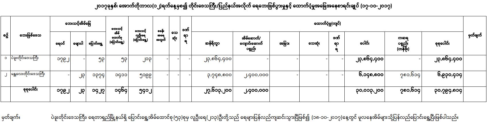 ၂၀၁၇ ခုနှစ်၊ အောက်တိုဘာလ (၁၂) ရက်နေ့မှ အောက်တိုဘာလ (၁၇) ရက်နေ့အထိ တိုင်းဒေသကြီး/ပြည်နယ်အလိုက် ရေဘေးဖြစ်ပွားမှုနှင့် ထောက်ပံ့မှုအခြေအနေစာရင်းချုပ်