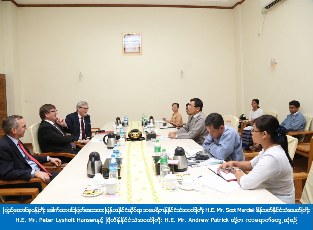 လူမှုဝန်ထမ်း၊ ကယ်ဆယ်ရေးနှင့် ပြန်လည်နေရာချထားရေးဝန်ကြီးဌာန ပြည်ထောင်စုဝန်ကြီး ဒေါက်တာဝင်းမြတ်အေးအား မြန်မာနုုိင်ငံဆိုင်ရာ အမေရိကန်နိုင်ငံသံအမတ်ကြီးH.E. Mr. Scot Marciel၊ ဒိန်းမတ်နိုင်ငံသံအမတ်ကြီးH.E. Mr. Peter Lysholt Hansenနှင့် ဗြိတိန် နိုင်ငံသံအမတ်ကြီး H.E. Mr. Andrew Patrick တို့က (၂၄-၁၀-၂၀၁၇) မွန်းလွဲပိုင်းတွင် အဆိုပါ ၀န်ကြီးရုံး မေခလာခန်းမတွင် လာရောက်တွေ့ဆုံခဲ့ပါသည်။