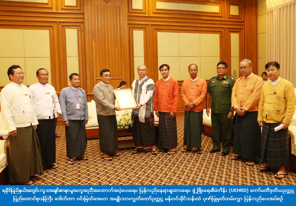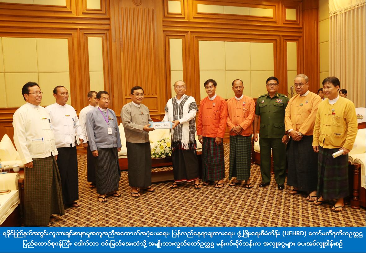 ရှေးဦးစွာ ရခိုင်ပြည်နယ်အတွင်း လူသားချင်းစာနာမှုအကူအညီအထောက်အပံ့ပေးရေး၊ ပြန်လည်နေရာ ချထားရေး၊ ဖွံ့ဖြိုးရေးဆောင်ရွက်ရန်အတွက် အမျိုးသားလွှတ်တော်ဥက္ကဋ္ဌ၏ အလှူဒါနခေါင်းစဉ်မှ လှူဒါန်း ငွေကျပ် ၃၀၂၀၀၀၀ နှင့် အမျိုးသားလွှတ်တော်ကိုယ်စားလှယ် (၂၂၄) ဦး၏ နေ့တွက်စရိတ် (၁) ရက်စာ စုစုပေါင်း လှူဒါန်းငွေကျပ် (၄၄၈၀၀၀၀) စုစုပေါင်းငွေကျပ် ရ၅ သိန်းကို အမျိုးသားလွှတ်တော်ဥက္ကဋ္ဌ မန်းဝင်းခိုင်သန်းက ရခိုင်ပြည်နယ်အတွင်း လူသားချင်းစာနာမှုအကူအညီအထောက်အပံ့ပေးရေး၊ ပြန်လည် နေရာချထားရေး၊ ဖွံ့ဖြိုးရေးစီမံကိန်း (UEHRD) ကော်မတီဒုတိယဥက္ကဋ္ဌ ပြည်ထောင်စုဝန်ကြီး ဒေါက်တာ ၀င်းမြတ်အေးထံသို့ ပေးအပ်လှူဒါန်းရာ ပြည်ထောင်စုဝန်ကြီးက ဂုဏ်ပြုမှတ်တမ်းလွှာ ပြန်လည်ပေးအပ်သည်။