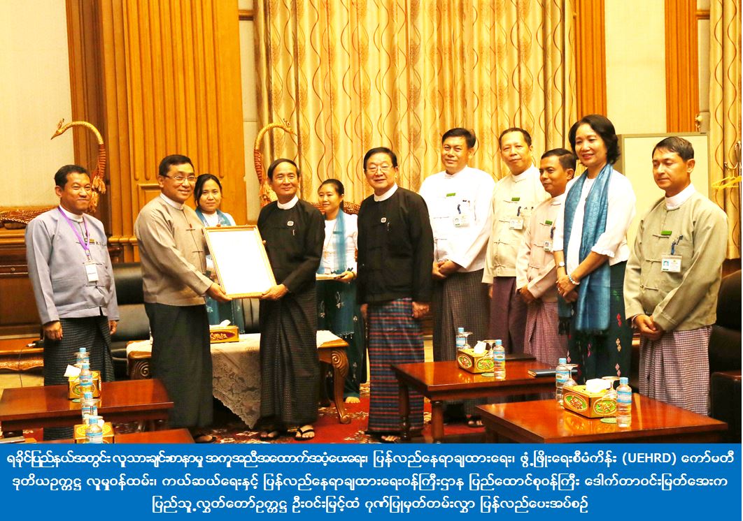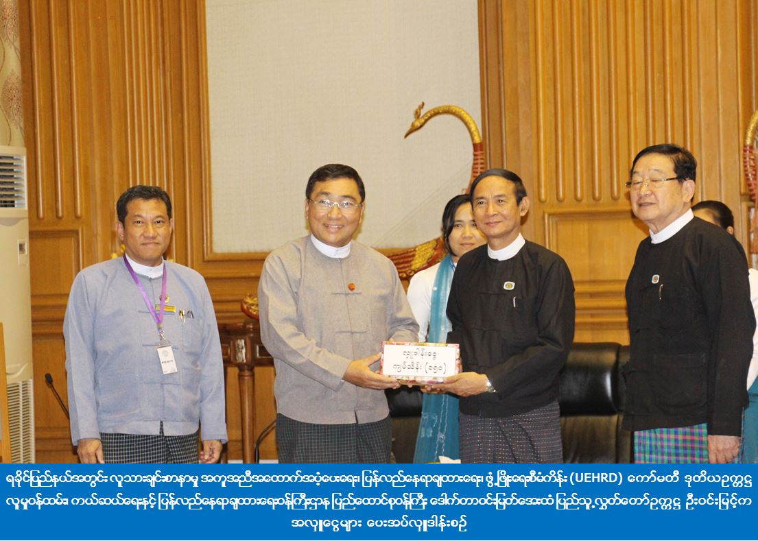 ရှေးဦးစွာ ပြည်သူ့လွှတ်တော်ဥက္ကဋ္ဌ ဦးဝင်းမြင့်က ရခိုင်ပြည်နယ်အတွင်း လူသားချင်းစာနာမှု အကူအညီ အထောက်အပံ့ပေးရေး၊ ပြန်လည်နေရာချထားရေး၊ ဖွံ့ဖြိုးရေးစီမံကိန်း ဆောင်ရွက်ရန်အတွက် ပြည်သူ့လွှတ်တော်ဥက္ကဋ္ဌ၏ အလှူဒါနခေါင်းစဉ်မှ လှူဒါန်းငွေ ကျပ် (၆၃) သိန်းနှင့် ပြည်သူ့လွှတ်တော် ကိုယ်စားလှယ်(၄၃၅)ဦး၏ နေ့တွက်စရိတ် တစ်ရက်စာ စုပေါင်းလှူဒါန်းငွေ ကျပ်(၈၇)သိန်း စုစုပေါင်း ကျပ်သိန်း (၁၅၀) အား ပေးအပ်လှူဒါန်းရာ ရခိုင်ပြည်နယ်အတွင်း လူသားချင်းစာနာမှု အကူအညီအထောက်အပံ့ပေးရေး၊ ပြန်လည်နေရာချထားရေး၊ ဖွံ့ဖြိုးရေးစီမံကိန်း (UEHRD) ကော်မတီ ဒုတိယဥက္ကဋ္ဌဖြစ်သည့် လူမှုဝန်ထမ်း၊ ကယ်ဆယ်ရေးနှင့် ပြန်လည်နေရာချထားရေးဝန်ကြီးဌာန ပြည်ထောင်စုဝန်ကြီး ဒေါက်တာဝင်းမြတ်အေးက လက်ခံရယူပြီး ဂုဏ်ပြုမှတ်တမ်းလွှာ ပြန်လည်ပေးအပ်သည်။