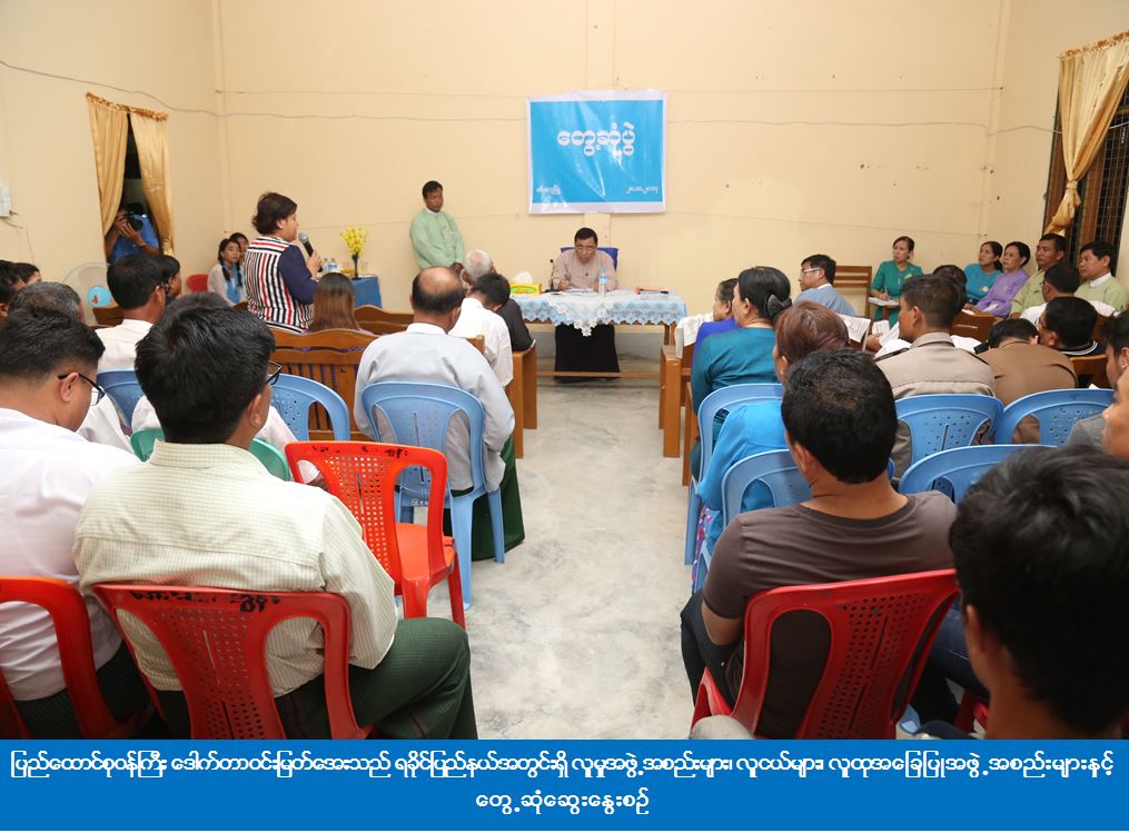 UEHRD စီမံကိန်းနှင့်ပတ်သက်၍ လူမှုဝန်ထမ်း၊ ကယ်ဆယ်ရေးနှင့် ပြန်လည်နေရာချထားရေးဝန်ကြီးဌာန ပြည်ထောင်စုဝန်ကြီး ဒေါက်တာဝင်းမြတ်အေးသည် ရခိုင်ပြည်နယ်လူမှုဝန်ထမ်းရုံး အစည်းအဝေးခန်းမတွင် ရခိုင်ပြည်နယ်အတွင်းရှိ လူမှုအဖွဲ့အစည်းများ၊ လူငယ်များ၊ လူထုအခြေပြု အဖွဲ့အစည်းများနှင့် ၂၈-၁၀-၂၀၁၇ ရက်နေ့ ညနေပိုင်းတွင် တွေ့ဆုံဆွေးနွေးခဲ့ကြပါသည်။