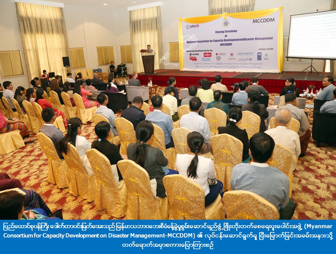 မြန်မာသဘာဝဘေးစီမံခန့်ခွဲမှုစွမ်းဆောင်ရည်ဖွံ့ဖြိုးတိုးတက်စေရေးပူးပေါင်းအဖွဲ့ (Myanmar Consortium for Capacity Development on Disaster Management-MCCDDM) ၏ လုပ်ငန်းဆောင်ရွက်မှု ပြီးမြောက်ခြင်းအခမ်းအနားကို (၃၀-၁၀-၂၀၁၇) ရက်နေ့၊ နံနက်ပိုင်းက နေပြည်တော်ဟိုတယ်ဇုံရှိ Horizon Lake View Hotel တွင် ကျင်းပပြုလုပ်ခဲ့ရာ လူမှုဝန်ထမ်း၊ ကယ်ဆယ်ရေးနှင့် ပြန်လည်နေရာချထားရေးဝန်ကြီးဌာန၊ ပြည်ထောင်စုဝန်ကြီး ဒေါက်တာဝင်းမြတ်အေး တက်ရောက်အမှာစကား ပြောကြားပါသည်။