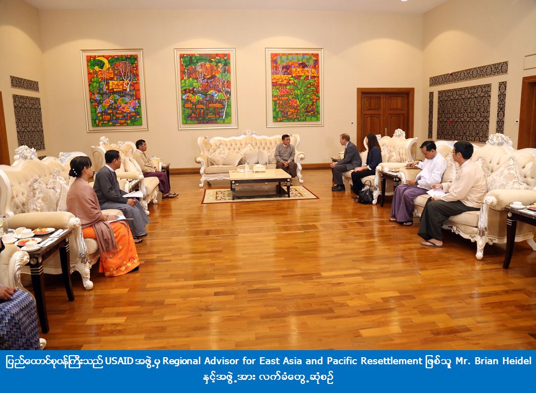 (၃၀-၁၀-၂၀၁၇) ရက်နေ့၊ နံနက်ပိုင်းတွင် ပြည်ထောင်စုဝန်ကြီးသည် USAID အဖွဲ့မှ Regional Advisor for East Asia and Pacific Resettlement ဖြစ်သူ Mr. Brian Heidel နှင့်အဖွဲ့အား အဆိုပါဟိုတယ်ရှိ သဇင်ခန်းမတွင် လက်ခံတွေ့ဆုံခဲ့ပါသည်။