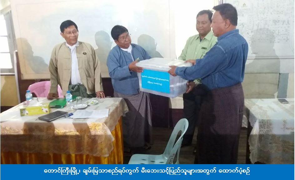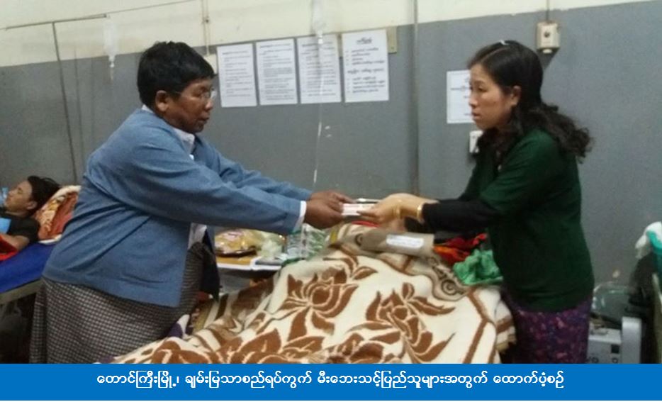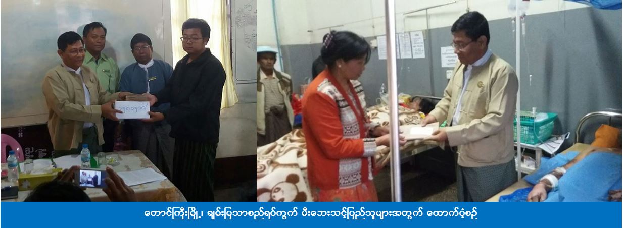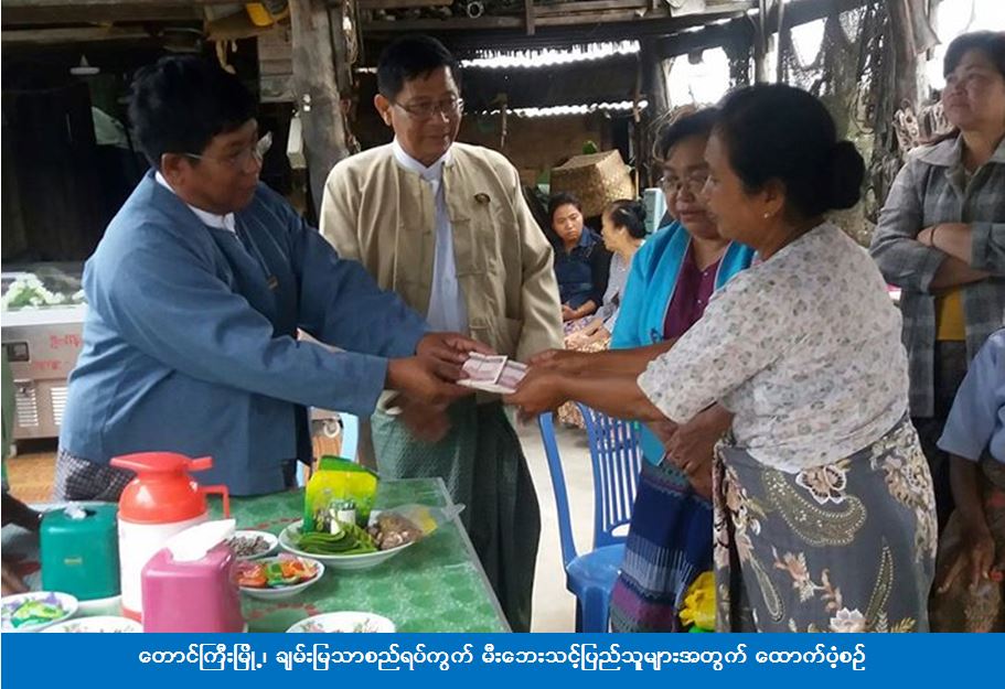 (၂၉-၁၀-၂၀၁၇) ရက်နေ့၊ ညပိုင်းတွင် တောင်ကြီးမြို့၊ ချမ်းမြသာစည်ရပ်ကွက်၌ မီးလောင်မှုကြောင့် ဘေးဒုက္ခကြုံတွေ့ခဲ့ရသော အိမ်ခြေ ၆ လုံး အိမ်ထောင်စု ၄ စု လူဦးရေ ၁၅ ဦး သေဆုံးသူ ၁ ဦးနှင့် ဒဏ်ရာရရှိသူ ၃ ဦးအတွက် ကယ်ဆယ်ရေးပစ္စည်း ၂၂ မျိုးအိမ်ထောင်စု ၄ စုစာ၊ အိမ်ဆောက်ပစ္စည်းထောက်ပံ့ငွေကျပ် (၁၁)သိန်း၊ နာရေးထောက်ပံ့ငွေကျပ် (၃) သိန်း၊ ဒဏ်ရာရထောက်ပံ့ငွေ (၁) သိန်းခွဲ၊ ဆန်ဘိုးထောက်ပံ့ငွေ (၃၁၅၀၀) ကျပ်၊ စုစုပေါင်း (၁၅၈၁၅၀၀) ကျပ်တိတိအား (၃၀-၁၀-၂၀၁၇) ရက်နေ့တွင် ဗမာတိုင်းရင်းသားရေးရာဝန်ကြီးနှင့်အတူ ရှမ်းပြည်နယ်ဦးစီးမှူးရုံး (ကဆရ) မှ တာဝန်ရှိသူများသည် ကွင်းဆင်းထောက်ပံ့ရေးဆောင်ရွက်ခဲ့ကြောင်း သိရှိရပါသည်။