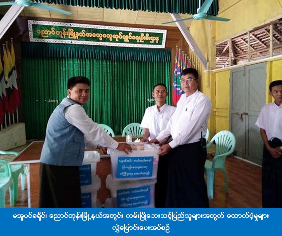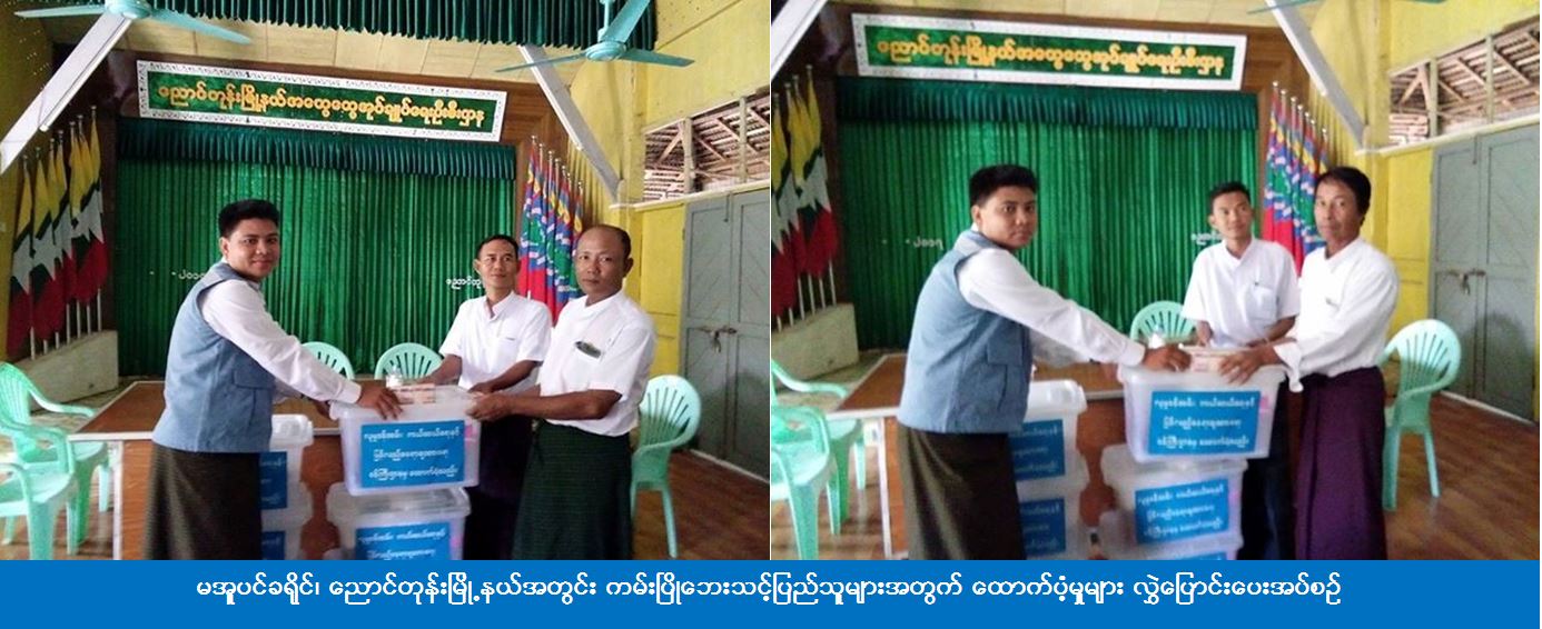 (၃၁-၁၀-၂၀၁၇) ရက်နေ့တွင် မအူပင်ခရိုင်ဦးစီးမှူးရုံး (ကဆရ) မှ တာဝန်ရှိသူများသည် ညောင်တုန်းမြို့နယ်အထွေထွေအုပ်ချုပ်ရေးဦးစီးဌာန၌ ကျေးရွာအုပ်စုအုပ်ချုပ်ရေးမှူးများထံသို့ ထောက်ပံ့ခဲ့ကြောင်း သိရှိရပါသည်။