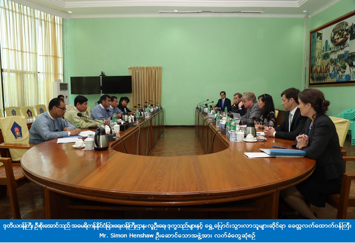 လူမှုဝန်ထမ်း၊ ကယ်ဆယ်ရေးနှင့် ပြန်လည်နေရာချထားရေးဝန်ကြီးဌာန၊ ဒုတိယဝန်ကြီး ဦးစိုးအောင်သည် အမေရိကန်နိုင်ငံခြားရေးဝန်ကြီးဌာန၊ လူဦးရေ၊ ဒုက္ခသည်များနှင့် ရွှေ့ပြောင်းသွားလာသူများဆိုင်ရာ ခေတ္တလက်ထောက်ဝန်ကြီး Mr. Simon Henshaw ဦးဆောင်သောအဖွဲ့အား (၃၁-၁၀-၂၀၁၇) ရက်နေ့၊ နေ့လည်ပိုင်းတွင် အဆိုပါ၀န်ကြီးရုံး၊ အစည်းအဝေးခန်းမ၌ ပြည်ထောင်စုဝန်ကြီး ကိုယ်စား လက်ခံတွေ့ဆုံခဲ့ပါသည်။