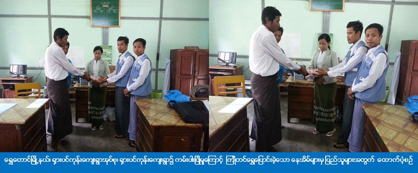 ကယ်ဆယ်ရေးနှင့် ပြန်လည်နေရာချထားရေးဦးစီးဌာန၊ ပြည်ခရိုင်ဦးစီးမှူးရုံးမှ တာဝန်ရှိသူများသည် ရွှေတောင်မြို့နယ်၊ ရှားပင်ကုန်းကျေးရွာအုပ်စု၊ ရှားပင်ကုန်းကျေးရွာ၌ (၁၆-၁၀-၂၀၁၇) ရက်နေ့တွင် ကမ်းပါးပြို်မှုကြောင့် ကြိုတင်ရွှေ့ပြောင်းခဲ့သော နေအိမ် (၁၀) လုံးအတွက် အိမ်ဆောက်ပစ္စည်းဖိုး (၁၀၀၀၀၀၀) ကျပ်၊ (၂၇-၁၀-၂၀၁၇) ရက်နေ့ မြစ်ကမ်းပါး ပြိုကျမှူကြောင့် ကြိုတင်ရွှေ့ပြောင်းခဲ့သည့် နေအိမ ်(၁၂) လုံးအတွက် အိမ်ဆောက်ပစ္စည်းဖိုး (၁၂၀၀၀၀၀) ကျပ်၊ စုစုပေါင်းအိမ်ဆောက်ပစ္စည်းဖိုး (၂၂၀၀၀၀၀) ကျပ်တိတိအား (၃၁-၁၀-၂၀၁၇) ရက်နေ့တွင် ရွှေတောင်မြို့နယ်၊ အထွေထွေအုပ်ချုပ်ရေးဦးစီးဌာန၌ ဘေးသင့့်ပြည်သူများ လက်ဝယ်ပေးအပ်ထောက်ပံ့ခဲ့ကြောင်း သိရှိရပါသည်။
