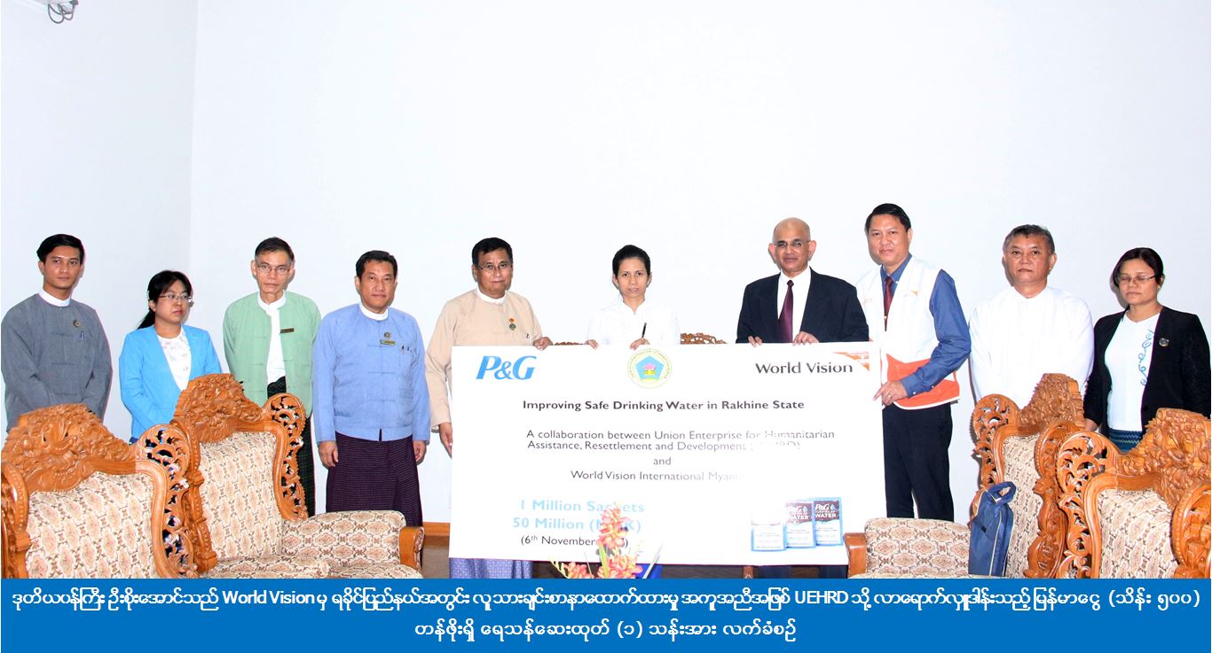 World Vision မှ ရခိုင်ပြည်နယ်အတွင်း လူသားချင်းစာနာထောက်ထားမှု အကူအညီအဖြစ် မြန်မာငွေ (သိန်း ၅၀၀) တန်ဖိုးရှိ၊ ရေသန့်ဆေးထုတ်(၁)သန်းအား UEHRD သို့ (၆-၁၁-၂၀၁၇) ရက်နေ့၊ နေ့လည်ပိုင်းတွင် လာရောက်လှူဒါန်းခဲ့ရာ လူမှုဝန်ထမ်း၊ ကယ်ဆယ်ရေးနှင့် ပြန်လည်နေရာချထားရေးဝန်ကြီးဌာန၊ ဒုတိယဝန်ကြီး ဦးစိုးအောင်က လက်ခံခဲ့ပါသည်။