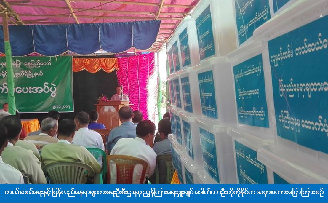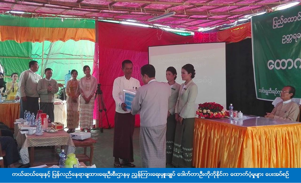 ၂၀၁၇ ခုနှစ်၊ (၉-၁၁-၂၀၁၇) ရက်နေ့တွင် ပြည်ထောင်စုနယ်မြေ၊ နေပြည်တော်၊ ဥတ္တရခရိုင်၊ ပုဗ္ဗသီရိမြို့နယ် တပင်ရွှေထီးရပ်ကွက်အတွင်းသို့ ပြောင်းရွှေ့ခဲ့သည့် အိမ်ထောင်စု (၅၉) စုအား လူမှုဝန်ထမ်း ကယ်ဆယ်ရေးနှင့် ပြန်လည်နေရာချထားရေးဝန်ကြီးဌာန နေပြည်တော်ကောင်စီနှင့် မြန်မာနိုင်ငံကြက်ခြေနီအသင်းတို့မှ ထောက်ပ့ံမှုများ ပေးအပ်ပွဲ ကျင်းပပြုလုပ်ခဲ့ရာ ကယ်ဆယ်ရေးနှင့် ပြန်လည်နေရာချထားရေးဦးစီးဌာနမှ ညွှန်ကြားရေးမှူးချုပ် ဒေါက်တာဦးကိုကိုနိုင်က အိမ်ဆောက်ပစ္စည်းဖိုး (၅၉၀၀၀၀၀) ကျပ်၊ လူဦးရေ (၁၉၄) ဦးအတွက် ဆန်ရိက္ခာဖိုးငွေ (၄၀၇၄၀၀) ကျပ်နှင့် (၅၉) အိမ်ထောင်စုအတွက် ကယ်ဆယ်ရေးပစ္စည်း (၁၀) မျိုးစီအား ပြည်သူများလက်ဝယ်သို့ ထောက်ပ့ံပေးအပ်ခဲ့ကြောင်း သိရှိရပါသည်။