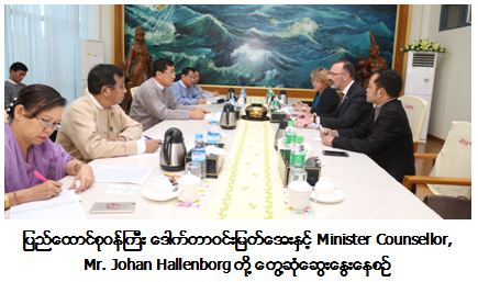 လူမှုဝန်ထမ်း၊ ကယ်ဆယ်ရေးနှင့် ပြန်လည်နေရာချထားရေးဝန်ကြီးဌာန၊ပြည်ထောင်စုဝန်ကြီး ဒေါက်တာဝင်းမြတ်အေးအား မြန်မာနိုင်ငံဆိုင်ရာဆွီဒင်သံရုံးမှMinister Counsellor ဖြစ်သူ Mr. Johan Hallenborg က ယနေ့နံနက်ပိုင်းတွင် အဆိုပါဝန်ကြီးရုံးမေခလာခန်းမ၌ လာရောက်တွေ့ဆုံ ခဲ့ပါသည်။