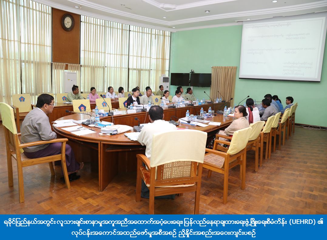 ရခိုင်ပြည်နယ်အတွင်း လူသားချင်းစာနာမှုအကူအညီအထောက်အပံ့ပေးရေး၊ ပြန်လည်နေရာချထားရေး ဖွံ့ဖြိုးရေးစီမံကိန်း(UEHRD)၏ လုပ်ငန်းအကောင် အထည်ဖော်မှုအစီအစဉ် ညှိနှိုင်းအစည်းအဝေးကို (၁၄-၁၁-၂၀၁၇) ရက်နေ့၊ မွန်းလွဲပိုင်းတွင် နေပြည်တော်ရှိ လူမှုဝန်ထမ်း၊ ကယ်ဆယ်ရေးနှင့် ပြန်လည်နေရာချထားရေးဝန်ကြီးဌာန အစည်းအဝေးခန်းမ၌ ကျင်းပသည်။
