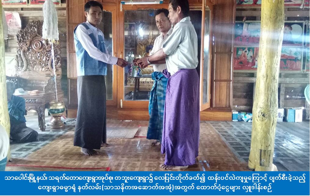 ဧရာဝတီတိုင်းဒေသကြီး၊ သာပေါင်းမြို့နယ်၊ သရက်တောကျေးရွာအုပ်စု၊ တဘူးကျေးရွာ၌ (၁၁-၁၁-၂၀၁၇) ရက်ေန့တွင် လေပြင်းတိုက်ခတ်၍ ထန်းပင်လဲကျမှုကြောင့် သစ်သားတိုင်၊ ကွန်ကရစ်ခင်း(၂၄x၆x၈)ပေရှိ ကျေးရွာဓမ္မာရုံ နတ်လမ်း(သာသနိကအဆောက်အအုံ)ပျက်စီးခဲ့၍ ရန်ပုံငွေကျပ်(၁၀၀၀၀) ကျပ်အား (၁၅-၁၁-၂၀၁၇) ရက်နေ့တွင် ဧရာ၀တီတိုင်းဒေသကြီးဦးစီးမှူးရုံး (ကဆရ) မှ တာ၀န်ရှိသူများသည် ကျေးရွာအုပ်ချုပ်ရေးမှူးနှင့် ဂေါပကအဖွဲ့၀င်များထံသို့ ကွင်းဆင်းထောက်ပံ့လှူဒါန်းခဲ့ပါကြောင်း သိရှိရပါသည်။