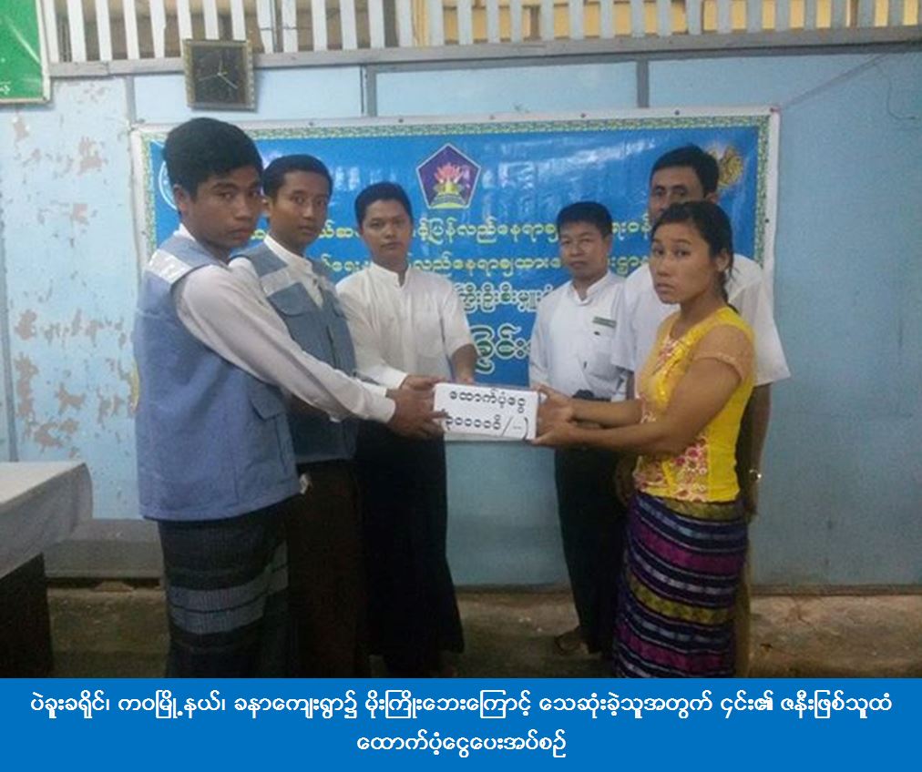 (၁၁-၁၁-၂၀၁၇) ရက်နေ့တွင် ပဲခူးခရိုင်၊ ကဝမြို့နယ်၊ ခနာကျေးရွာ၌ ဖြစ်ပွားခဲ့သော မိုးကြိုးဘေးကြောင့် သေဆုံးသူ ဦးကျော်ဇင်မိုး (၃၇) နှစ်၊ (ဘ) ဦးလှအေးအတွက် ထောက်ပံ့ငွေ (၃) သိန်းကျပ်အား (၁၅-၁၁-၂၀၁၇) ရက်နေ့တွင် ပဲခူးတိုင်းဒေသကြီးဦးစီးမှူးရုံး (ကဆရ) မှ တာဝန်ရှိသူများသည် သေဆုံးသူ၏ ဇနီးဖြစ်သူ မနှင်းအိဖြူ ထံသို့ ထောက်ပံ့ပေးခဲ့ကြောင်း သိရှိရပါသည်။