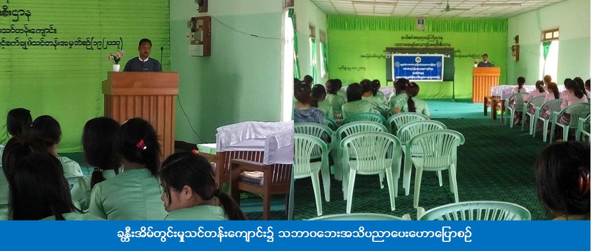ကယ်ဆယ်ရေးနှင့် ပြန်လည်နေရာချထားရေးဦးစီးဌာန၊ ခန္တီးခရိုင်ဦးစီးမှူးရုံး (ကဆရ) မှ တာဝန်ရှိသူများသည် (၁၇-၁၁-၂၀၁၇) ရက်နေ့၊ (၁၃းဝဝ ~ ၁၄း၃၀) နာရီအချိန်တွင် ခန္တီးအိမ်တွင်းမှုသင်တန်းကျောင်းရှိ သင်တန်းသူ (၆၀) ဦးအား သဘာဝဘေးအန္တရာယ်ဆိုင်ရာ အသိပညာပေးဆွေးနွေးဟောပြောမှုများဆောင်ရွက်ခဲ့ပြီး လက်ကမ်းစာစောင်များ ဖြန့်ဝေပေးခဲ့ကြောင်း သိရှိရပါသည်။