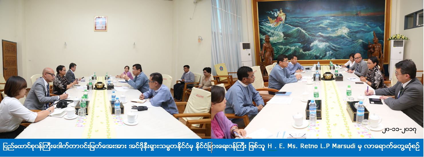 လူမှုဝန်ထမ်း၊ ကယ်ဆယ်ရေးနှင့် ပြန်လည်နေရာချထားရေးဝန်ကြီးဌာန၊ ပြည်ထောင်စုဝန်ကြီး ဒေါက်တာဝင်းမြတ်အေးအား အင်ဒိုနီးရှားသမ္မတနိုင်ငံမှ နိုင်ငံခြားရေးဝန်ကြီးဖြစ်သူ H.E. Ms. Retno L.P Marsudi က (၁၉-၁၁-၂၀၁၇) ရက်နေ့၊ ညနေပိုင်းတွင် အဆိုပါ၀န်ကြီးရုံးမေခလာခန်းမ၌ လာရောက်တွေ့ဆုံပါသည်။