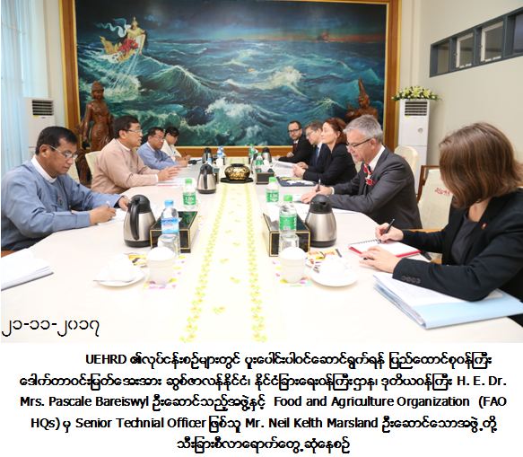 ဆွစ်ဇာလန်နိုင်ငံ၊ နိုင်ငံခြားရေးဝန်ကြီးဌာန၊ ဒုတိယဝန်ကြီး H. E. Dr. Mrs. Pascale Bareiswyl ဦးဆောင်သည့်အဖွဲ့နှင့်တွေ့ဆုံရာတွင် ဆွစ်ဇာလန်နိုင်ငံနှင့် မြန်မာနိုင်ငံတို့ သံတမန်ဆက်ဆံရေး ထူထောင်မှု နှစ်(၆၀) ရှိကာ (၂) နိုင်ငံနီးကပ်စွာ ပူးပေါင်းဆောင်ရွက်လျက်ရှိမှုများ၊ ဆွစ်ဇာလန် နိုင်ငံမှ မြန်မာနိုင်ငံတွင် ကချင်ပြည်နယ်၊ ရှမ်းပြည်နယ်၊ ကရင်ပြည်နယ်နှင့် အခြားသောဒေသများ တွင် လူသားချင်းစာနာကူညီမှုလုပ်ငန်း၊ ငြိမ်းချမ်းရေးနှင့်ဖွံ့ဖြိုးတိုးတက်ရေးလုပ်ငန်းများဆောင် ရွက်နေမှုများအား ရှင်းလင်းတင်ပြပြီး ရေရှည်ဖွံ့ဖြိုးတိုးတက်မှုလုပ်ငန်းများအတွက် နိုင်ငံ တော်အား ဆက်လက်အကူအညီပေးမည်ဖြစ်ပြီး UEHRD ၏ လုပ်ငန်းများအား ဆွေးနွေးမေးမြန်း ပါသည်။