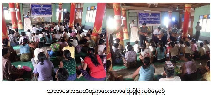 ကယ်ဆယ်ရေးနှင့်ပြန်လည်နေရာချထားရေးဦးစီးဌာန၊ ပြည်ခရိုင်ဦးစီးမှူးရုံးမှ တာဝန်ရှိသူများသည် (၂၂-၁၁-၂၀၁၇)တွင် သာယာဝတီခရိုင်၊ နတ္တလင်းမြို့နယ် ၊ ရေကြည်ကျေးရွာအုပ်စု၊ ဘုန်းကြီးရေဆည်ကျေးရွာတွင် သဘာဝဘေးအန္တရာယ်ဆိုင်ရာ အသိပညာပေးဟောပြောပွဲ၊ သဘာဝဘေးအန္တရာယ်နှင့်ပက်သက်သည့်ကြိုတင်ပြင်မှုများ၊ ဆောင်ရန်/ရှောင်ရန် များအားဟောပြောခြင်း၊ ကျေးရွာသူ/သားများအား လက်ကမ်းစာဆောင်နှင့် ခေါက်ဆွဲထုတ် (၁၀၀) အားပေးအပ်ခဲ့ပြီး ကျေးရွာသူ/သား ၊ ကျောင်းသူ /ကျောင်းသားများ လူဦးရေ စုစုပေါင်း (၁၀၀)ဦးခန့် ၊ တာပွန်မြို့နယ် ရဲစခန်းမှ ရဲအုပ်နှင့် တပ်ဖွဲ့ဝင်များ တက်ရောက်ခဲ့ကြောင်း သတင်းရရှိပါသည်။