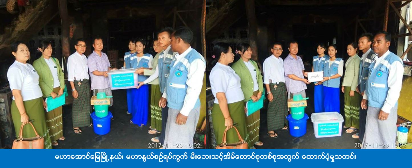 ကယ်ဆယ်ရေးနှင့် ပြန်လည်နေရာချထားရေးဦးစီးဌာန၊ မန္တလေးတိုင်းဒေသကြီးဦးစီးမှူးရုံးမှ တာဝန်ရှိသူများသည် မဟာအောင်မြေမြို့နယ်၊ မဟာနွယ်စဉ်ရပ်ကွက်၌် (၁၈-၁၁-၂၀၁၇) ရက်နေ့တွင် ဖြစ်ပွားခဲ့သော မီးဘေးကြောင့် လုံးဝပျက်စီးခဲ့သည့် တိုက်အိမ် (၁) လုံးအတွက် အိမ်ဆောက်ပစ္စည်းဖိုး ကျပ်ငွေ (၂၀၀၀၀၀) ကျပ်တိတိ၊ ဘေးသင့်လူဦးရေ (၅) ဦးအတွက် ဆန်ရိက္ခာဖိုး(၇)ရက်စာ ကျပ်ငွေ(၁၀၅၀၀)တိတိနှင့် ကယ်ဆယ်ရေးပစ္စည်း(၁၆)မျိုးပါ အိမ်ထောင်စု(၁)စုစာနှင့် Hygiene Kits ၁ စုံတို့အား (၂၃-၁၁-၂၀၁၇) ရက်နေ့တွင် သွားရောက်ထောက်ပံ့ခဲ့ကြောင်း သိရှိရပါသည်။