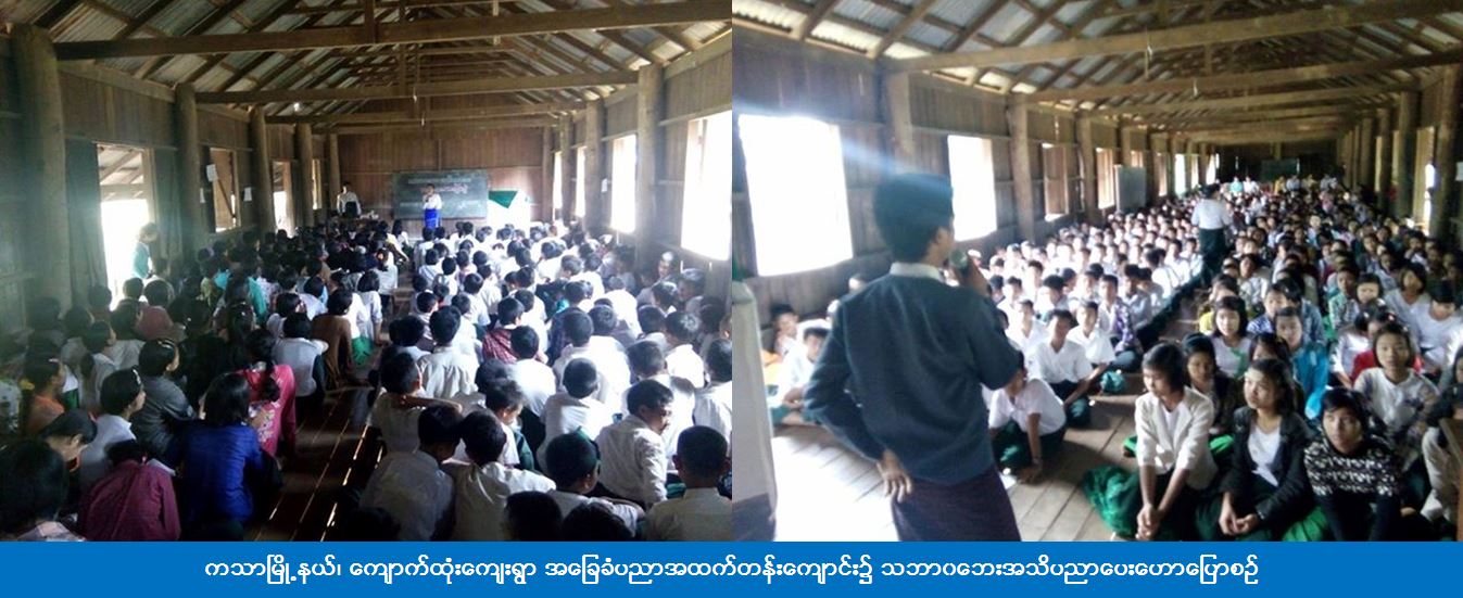 ကယ်ဆယ်ရေးနှင့် ပြန်လည်နေရာချထားရေးဦးစီးဌာန၊ ကသာခရိုင်ဦးစီးမှူးရုံးမှ တာဝန်ရှိသူများသည် (၂၃-၁၁-၂၀၁၇) ရက်နေ့တွင် ကသာမြို့နယ်၊ ကျောက်ထုံးကျေးရွာ အခြေခံပညာအထက်တန်းကျောင်း၌ သဘာဝဘေးအသိပညာပေးဟောပြောပွဲကျင်းပပြုလုပ်ရာ တာဝန်ရှိသူများက ကျောင်းသူ၊ ကျောင်းသား (၄၉၀) ဦးခန့်အား သဘာဝဘေးအန္တရာယ်ဆိုင်ရာ ဆောင်ရန် ရှောင်ရန်များနှင့် မြန်မာနိုင်ငံတွင် ဖြစ်ပွားတတ်သော သဘာဝဘေးများအကြောင်း ဆွေးနွေးဟောပြောခဲ့ပြီး သဘာဝဘေးအသိပညာပေး ဗွီနိုင်းများ၊ လက်ကမ်းစာစောင်များနှင့် ကျောင်းသုံးဗလာစာအုပ်၊ ဘောပင်၊ ခဲတံတို့ကို ဖြန့်ဝေပေးခဲ့ကြောင်း သိရှိရပါသည်။