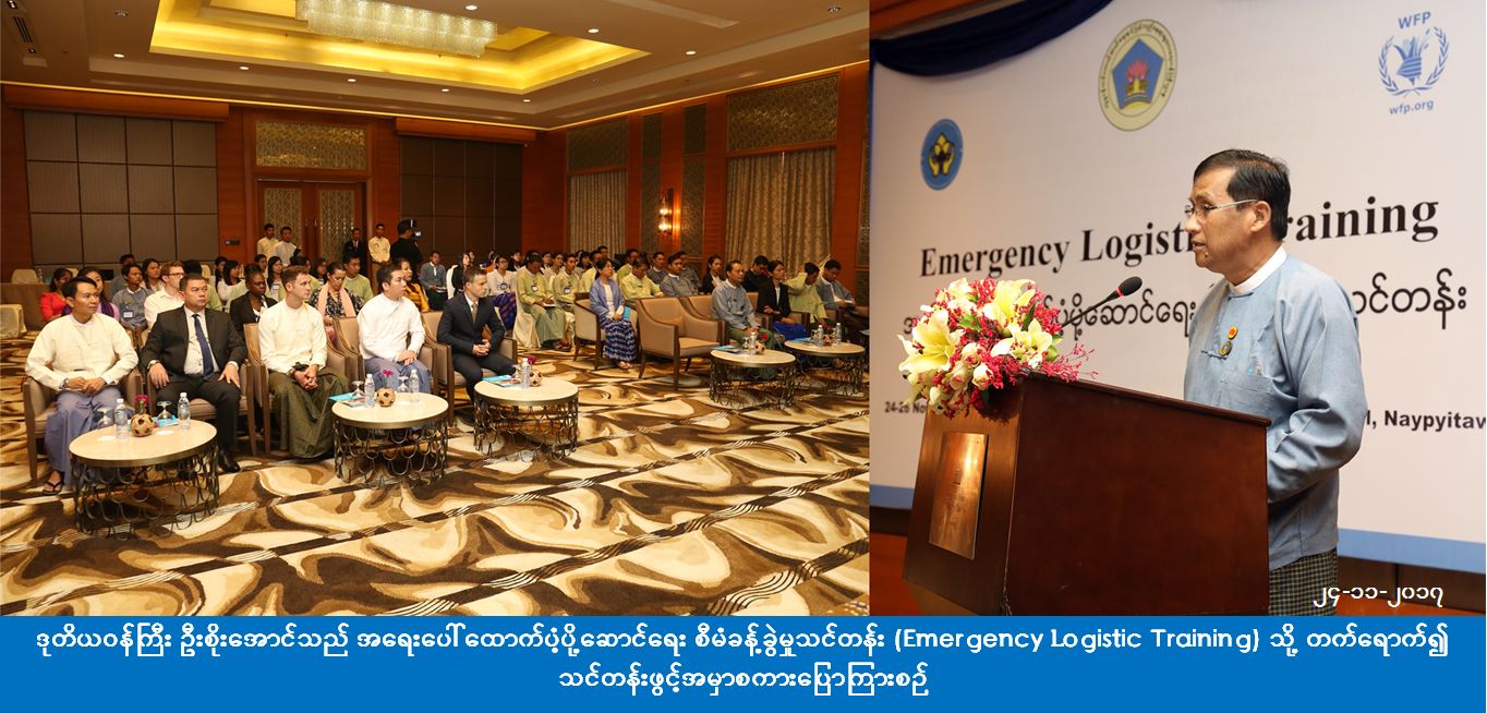 မြန်မာနိုင်ငံအတွင်း သဘာဝဘေးအန္တရာယ်များဖြစ်ပွားလာပါက အရေးပေါ်အခြေအနေတွင် ချက်ချင်းတုံံ့ပြန်ရေးလုပ်ငန်းများ ပိုမိုထိရောက်အောင်မြင်စွာတုံ့ပြန်ဆောင်ရွက်နိုင်စေရန်နှင့် ထောက်ပံ့ရေးလုပ်ငန်းစွမ်းဆောင်ရည်များ မြင့်မားစေရန်ရည်ရွယ်၍ ကယ်ဆယ်ရေးနှင့် ပြန်လည်နေရာချထားရေးဦးစီးဌာနနှင့် ကမ္ဘာ့စားနပ်ရိက္ခာအစီအစဉ်တို့ ပူးပေါင်းဖွင့်လှစ်သည့် အရေးပေါ်ထောက်ပံ့ပို့ဆောင်ရေး စီမံခန့်ခွဲမှုသင်တန်း(Emergency Logistic Training) ဖွင့်လှစ်ခြင်းအခမ်းအနားကို (၂၄-၁၁-၂၀၁၇) ရက်နေ့၊ နံနက်ပိုင်းတွင် နေပြည်တော် Kempinski Hotel ၌ ကျင်းပပြုလုပ်ရာ လူမှုဝန်ထမ်း၊ ကယ်ဆယ်ရေးနှင့် ပြန်လည်နေရာချထားရေးဝန်ကြီးဌာန ဒုတိယဝန်ကြီး ဦးစိုးအောင် တက်ရောက်၍ သင်တန်းဖွင့်အမှာစကား ပြောကြားခဲ့ပြီး ရန်ကုန်မြို့ ကျိုက်ဝိုင်းသိုလှောင်ရုံဝန်းအတွင်းရှိ သိုေလှာင်ရုံအမှတ် (၁၄) ပြုပြင်မွမ်းမံရန်အတွက် အမေရိကန် ဒေါ်လာ (၅၀၀၀၀) နှင့် သိုလှောင်ရုံအတွင်း ကယ်ဆယ်ရေးစ္စည်း သိုလှောင်ထိန်းသိမ်းမှုဆိုင်ရာ ဆက်စပ်ပစ္စည်းကိရိယာများအတွက် အမေရိကန်ဒေါ်လာ (၂၀၀၀၀ )တန်ဖိုးရှိ ပစ္စည်းများအား WFP မှ Head of Supply Chain, Mr. Jean Luc Kohler က လွှဲပြောင်းေပးအပ်ရာ လူမှုဝန်ထမ်း၊ ကယ်ဆယ်ရေးနှင့် ပြန်လည်နေရာချထားရေးဝန်ကြီးဌာန ဒုတိယဝန်ကြီးက လက်ခံရယူပြီး ဂုဏ်ပြုမှတ်တမ်းလွှာ ပြန်လည်ပေးအပ်ခဲ့ပါကြောင်းသတင်းရရှိပါသည်။