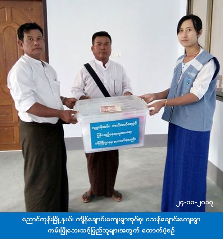 ဧရာဝတီတိုင်းဒေသကြီး၊ မအူပင်ခရိုင်၊ ညောင်တုန်းမြို့နယ်၊ ကျိန်ချောင်းကျေးရွာအုပ်စု၊ ငသန့်ချောင်းကျေးရွာ၌ (၂၁-၁၁-၂၀၁၇) ရက်နေ့တွင် ကမ်းပြိုဘေးကြောင့် ဖျက်သိမ်းပြောင်းရွှေ့ခဲ့သည့် နေအိမ် (၃) လုံး၊ အိမ်ထောင်စု (၃) စုစာအတွက် ကယ်ဆယ်ရေးပစ္စည်း (၁၀) မျိုး၊ အိမ်ဆောက်ပစ္စည်းရန်ပုံငွေ (၃၀၀၀၀၀) ကျပ်၊ စုစုပေါင်း လူဦးရေ (၁၀) ဦးစာအတွက် ဆန်ရိက္ခာရန်ပုံငွေ (၂၁၀၀၀) ကျပ် စုစုပေါင်းရန်ပုံငွေ (၃၂၁၀၀၀) ကျပ် (ကျပ်သုံးသိန်းနှစ်သောင်းတစ်ထောင်တိတိ) အား (၂၄-၁၁-၂၀၁၇) ရက်နေ့တွင် ထောက်ပံ့ပေးအပ်ခဲ့ကြောင်း သိရှိရပါသည်။
