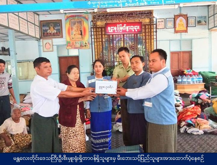 ကယ်ဆယ်ရေးနှင့် ပြန်လည်နေရာချထားရေးဦးစီးဌာန၊ မန္တလေးတိုင်းဒေသကြီး ဦးစီးမှူးရုံးမှ တာဝန်ရှိသူများသည် (၃၀-၁၁-၂၀၁၇)ရက်နေ့တွင် ချမ်းမြသာစည်မြို့နယ်၌ ဖြစ်ပွားခဲ့သော မီးဘေးကြောင့် လုံးဝပျက်စီးအိမ်ခြေ(၇)လုံးအတွက် အိမ်ဆောက်ပစ္စည်းတန်ဖိုး ငွေကျပ် (၉၀၀,၀၀၀)၊ ဘေးသင့်လူဦးရေ (၄၇)ဦးအတွက် ဆန်ရိက္ခာတန်ဖိုး (၇)ရက်စာ ငွေကျပ် (၉၈,၇၀၀)နှင့် အိမ်ထောင်စု(၁၄)စုစာအတွက် ကယ်ဆယ်ရေးပစ္စည်း(၁၆)မျိုးနှင့် Hygiene Kits (၁၄)စုံ တို့အား (၁-၁၂-၂၀၁၇)ရက်နေ့တွင် သွားရောက်ထောက်ပံ့ခဲ့ကြောင်း သတင်းရရှိပါသည်။