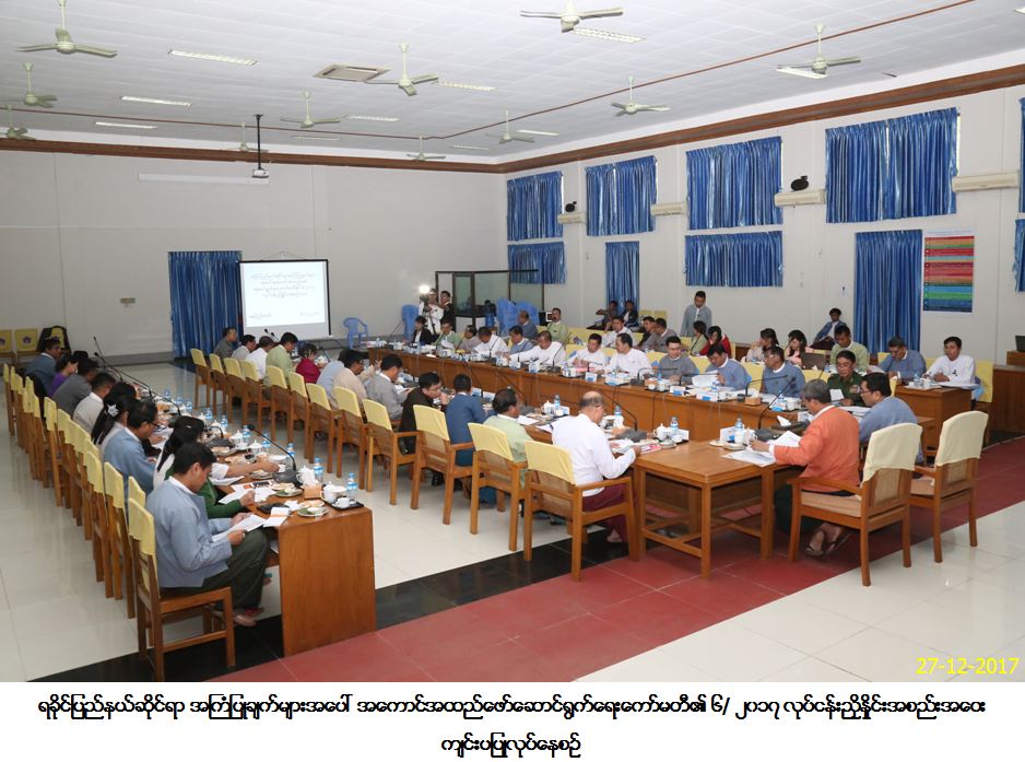 ၁။ ရခိုင်ပြည်နယ်ဆိုင်ရာ အကြံပြုချက်များအပေါ် အကောင်အထည်ဖော်ဆောင်ရွက်ရေးကော်မတီ၏ ၆/၂၀၁၇ လုပ်ငန်းညှိနှိုင်းအစည်းအဝေးကို ဒီဇင်ဘာလ (၂၆)ရက်နေ့ (၁၄:၀၀)နာရီက လူမှုဝန်ထမ်း၊ ကယ်ဆယ်ရေးနှင့် ပြန်လည်နေရာချထားရေးဝန်ကြီးဌာန၊ အစည်းအဝေးခန်းမတွင်ကျင်းပရာ၊ ရခိုင်ပြည်နယ် ဆိုင်ရာအကြံပြုချက်များအပေါ် အကောင်အထည်ဖော်ဆောင်ရွက်ရေးကော်မတီ ဥက္ကဌ၊ လူမှုဝန်ထမ်း၊ ကယ်ဆယ်ရေးနှင့် ပြန်လည်နေရာချထားရေးဝန်ကြီးဌာန၊ ပြည်ထောင်စုဝန်ကြီး ဒေါက်တာဝင်းမြတ်အေးက အဖွင့်အမှာစကားပြောကြားရာတွင် ရခိုင်ပြည်နယ်ဆိုင်ရာ အကြံပြုချက်များအပေါ် အကောင်အထည်ဖော် ဆောင်ရွက်ရေးကော်မတီအနေဖြင့် ဆောင်ရွက်ရမည့်လုပ်ငန်းများကို ညှိနှိုင်းအစည်းအဝေးများကျင်းပ၍ လုပ်ငန်းများဆောင်ရွက်နေသည်မှာ ယခုအကြိမ်အပါအဝင် (၆) ကြိမ်ရှိနေပြီဖြစ်ပါကြောင်း၊ အစီရင်ခံစာ၏ အကြံပြုဖော်ပြချက်များသည် ရခိုင်ဒေသဖွံ့ဖြိုးတိုးတက်ရေး၊ ဒေသတွင်းပြည်သူများ လူမှုစီးပွားဘဝဖွံ့ဖြိုး တိုးတက်ရေးတို့အတွက် အဓိကထား၍ အကြံပြုထားသည့်လုပ်ငန်းများဖြစ်ကြောင်း၊ လုပ်ငန်းများအောင်မြင် အောင်ဆောင်ရွက်ခြင်းသည် ဖွံ့ဖြိုးတိုးတက်မှုကို ဦးတည်ခြင်းဖြစ်ပြီး ရခိုင်ဒေသသာမက နိုင်ငံတစ်ခုလုံး၏ ဖွံ့ဖြိုးတိုးတက်ခြင်းပင်ဖြစ်ပါကြောင်း၊ အကြံပြုချက်တွင်ဖော်ပြထားသည့် ကဏ္ဍ (၁၈) ခုရှိပြီး ကဏ္ဍတိုင်းတွင် ဝန်ကြီးဌာနတစ်ခုတည်းအကောင်အထည်ဖော်ရသော လုပ်ငန်းရပ်များထက် ဝန်ကြီးဌာနသုံး၊လေးခု ပေါင်းစပ် အကောင်အထည်ဖော်ရသောလုပ်ငန်းရပ်များက ပိုမိုများပြားပါကြောင်း၊ ထို့ကြောင့် ပေါင်းစပ်ညှိနှိုင်းခြင်းသည် အဓိကအရေးကြီးပါကြောင်း၊ အစီရင်ခံစာပါ ကဏ္ဍရပ်များကို မကြာခဏ ပြန်လည်လေ့လာသုံးသပ်၍ အမြန်ဆုံး အကောင်အထည်ဖော်နိုင်မည့်လုပ်ငန်းများကို ရွေးချယ်ဦးစားပေးဆောင်ရွက်ကြ စေလိုပါကြောင်း၊ ကော်မတီ၏ လုပ်ငန်းတာဝန်သတ်မှတ်ချက်အရ ကော်မတီအနေဖြင့် (၄) လတစ်ကြိမ် အစီရင်ခံစာထုတ်ပြန်၍ ပြည်သူသို့ အသိပေးရမည်ဖြစ်၍ ကော်မတီဝင်ဝန်ကြီးဌာနများအနေဖြင့် လေးလအတွင်း အကြံပြုချက်များနှင့်စပ်လျဉ်း၍ ဆောင်ရွက်ပြီးစီးမှုကို တိုတိုကျဉ်းကျဉ်းနှင့် ထိထိမိမိရေးသား၍ အစီရင်ခံစာများပေးပို့နိုင်ရေးဆောင်ရွက် ပေးကြစေလိုကြောင်း၊ ကော်မတီ၏လုပ်ငန်းဆောင်ရွက်မှုများအပေါ် ပိုမိုတိုးမြှင့်နိုင်ရေးအတွက် ပြည်တွင်း ပြည်ပအတွေ့အကြုံများကိုအခြေခံ၍ အကြံပြုပေးမည့် အကြံပေးအဖွဲ့ကို ဖွဲ့စည်းပေးထားပြီးဖြစ်၍ မိမိတို့ ကော်မတီနှင့် အကြံပေးအဖွဲ့တို့ ဇန်နဝါရီလ နောက်ဆုံးရက်သတ္တပတ်တွင် တွေ့ဆုံဆွေးနွေးညှိနှိုင်းရန် စီစဉ်ထား ပါကြောင်း၊ ယနေ့အစည်းအဝေးတွင် ဝန်ကြီးဌာနများအနေဖြင့် မိမိတို့၏
