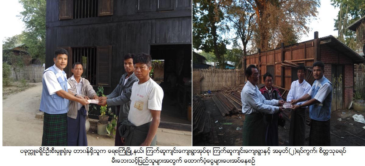 လူမှုဝန်ထမ်း၊ ကယ်ဆယ်ရေးနှင့်ပြန်လည်နေရာချထားရေးဝန်ကြီးဌာန၊ ကယ်ဆယ်ရေးနှင့် ပြန်လည်နေရာချထားရေးဦးစီးဌာန၊ ပခုက္ကူ ခရိုင်ဦးစီးမှူးရုံးမှ တာဝန်ရှိသူများသည် ရေစကြိုမြို့နယ်၊ ကြက်ဆူကျင်းကျေးရွာအုပ်စု၊ ကြက်ဆူကျင်းကျေးရွာတွင် (၂၅-၁၂-၂၀၁၇)ရက်နေ့ ၌ ဖြစ်ပွားခဲ့သောမီးဘေးကြောင့် ပြောင်းရွှေ့အိမ်ခြေ (၁) လုံး၊ အိမ်ထောင်စု (၁) စု၊ လူဦးရေ(၄)ဦးအတွက် ကယ်ဆယ်ရေးပစ္စည်း(၁၀)မျိုး၊ အိမ်ဆောက်ပစ္စည်းဖိုး (၁၀၀၀၀၀/-) ကျပ်၊ ဆန်ရိက္ခာဖိုး (၈၄၀၀/-)ကျပ်နှင့် (၂၃-၁၂-၂၀၁၇)ရက်နေ့တွင် အမှတ်(၂)ရပ်ကွက်၊ စိတ္တသုခရပ်၌ ဖြစ်ပွားခဲ့သောမီးဘေးကြောင့် ပြောင်းရွှေ့အိမ်ခြေ (၁)လုံး၊ အိမ်ထောင်စု(၁)စု၊ လူဦးရေ(၄)ဦးအတွက် ကယ်ဆယ်ရေးပစ္စည်း(၁၀)မျိုး၊ အိမ်ဆောက်ပစ္စည်းဖိုး(၁၀၀၀၀၀/-)ကျပ်၊ ဆန်ရိက္ခာဖိုး (၈၄၀၀/-)ကျပ်တို့အား (၂၆-၁၂-၂၀၁၇)ရက်နေ့တွင် ဘေးသင့်ပြည်သူများ၏ လက်ဝယ်အရောက် ထောက်ပံ့ပေးအပ်ခဲ့ကြောင်း သတင်းရရှိပါသည်။