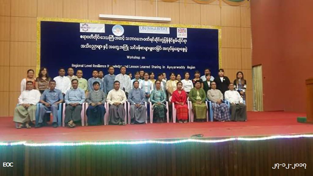 ကယ်ဆယ်ရေးနှင့် ပြန်လည်နေရာချထားရေးဦးစီးဌာန၊ ဧရာဝတီတိုင်းဒေသကြီးဦးစီးမှူးရုံးနှင့် UN- Habitats တို့ပူးပေါင်း၍ တိုင်းဒေသကြီးအဆင့် သဘာဝဘေးဒဏ် ရင်ဆိုင်တုံ့ပြန်နိုင်စွမ်းဆိုင်ရာ အသိပညာများနှင့် အတွေ့အကြံု သင်ခန်းစာများ မျှဝေခြင်း အလုပ်ရုံဆွေးနွေးပွဲအား ယနေ့ (၂၇-၁၂-၂၀၁၇) ရက်နေ့၊ နံနက် (၀၉းဝဝ) နာရီမှ (၁၅း၃၀) နာရီအချိန်တွင် ပုသိမ်မြို့မြို့တော်ခန်းမ၌ ကျင်းပရာ ဧရာဝတီတိုင်းဒေသကြီးအစိုးရအဖွဲ့ လူမှုရေးဝန်ကြီးမှ အဖွင့်မိန့်ခွန်းပြောကြားပြီး ဧရာဝတီတိုင်းဒေသကြီး ဦးစီးမှူး ဦးသန်းစိုး (ကဆရ) မှ အလုပ်ရုံဆွေးနွေးပွဲ ကျင်းပရခြင်း ရည်ရွယ်ချက်အား ရှင်းပြ၍ ဖွင့်ပွဲအခမ်းအနားပြုလုပ်ခဲ့ပါသည်။ အဆိုပါအလုပ်ရုံဆွေးနွေးပွဲသို့ သဘာဝဘေးအန္တရာယ်စီမံခန့်ခွဲမှုနှင့် သက်ဆိုင်သည့် တိုင်းအဆင့်ဌာနဆိုင်ရာများ စုစုပေါင်းလူဦးရေ (၅၀) ဦးဖြင့် ကျင်းပပြုလုပ်သွားမည် ဖြစ်ကြောင်း သိရှိရပါသည်။